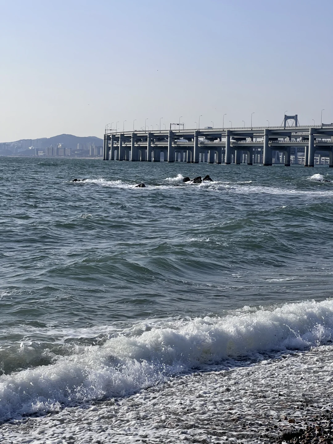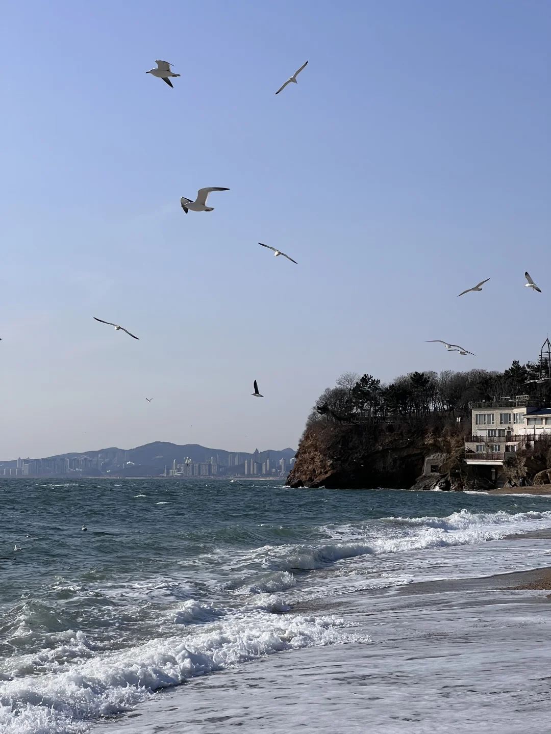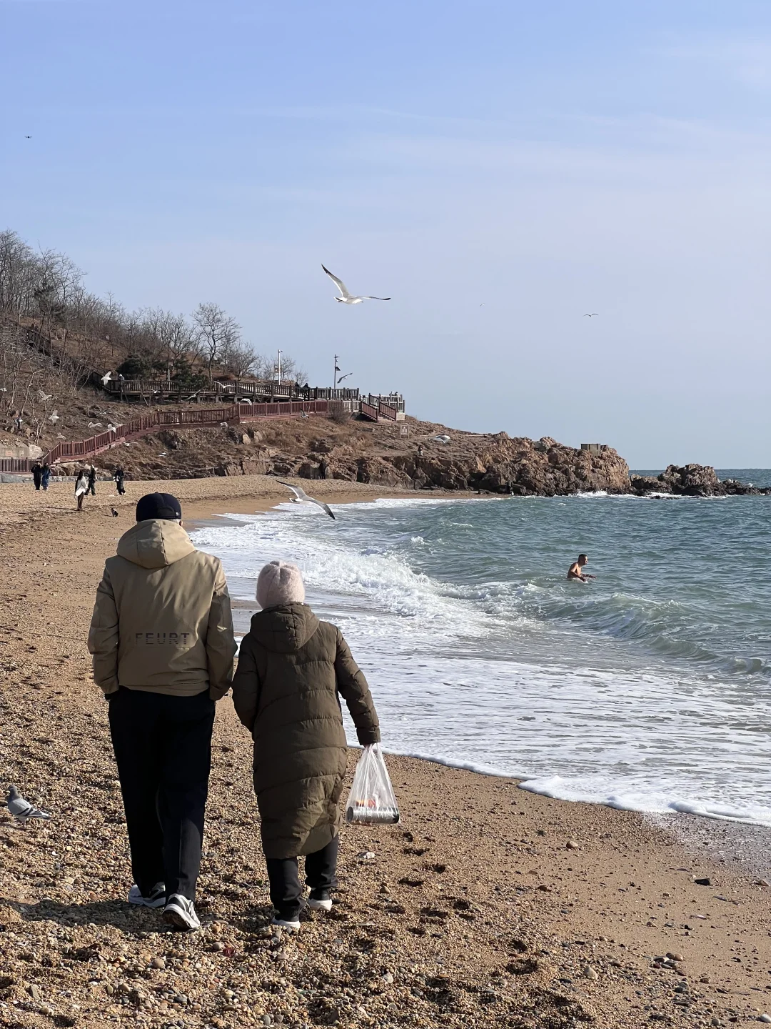 直接打车在对面吃了海肠捞饭过来消食,海滩上有卖糖葫芦的(5r)拿着边走边吃边看海🌊天气好海水很蓝,海鸥在上空盘旋非常漂亮,拍拍照看看景差不多半小时。