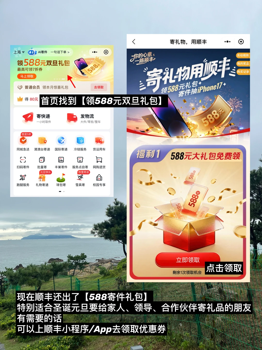 现在顺丰还有【588寄件礼包】,新用户单笔最高减30元,特别适合圣诞元旦要给家人、朋友、合作伙伴寄礼品的朋友,有需要的话,可以上顺丰小程序/App去领取优惠券哦!具体领取步骤可见图6!
