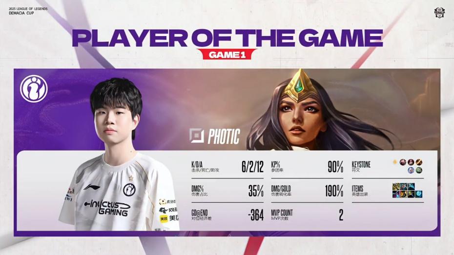 虎扑12月23日讯Photic希维尔打出6/2/12战绩,斩获IG对战WE首局MVP。