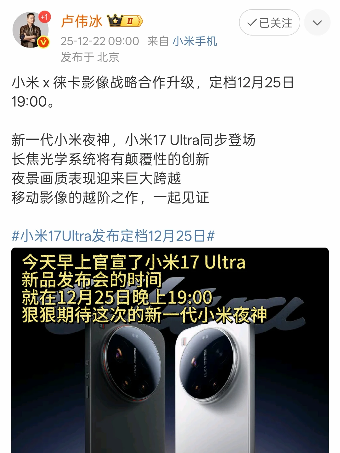 就刚刚小米17 Ultra官宣了 12月25日正式发布