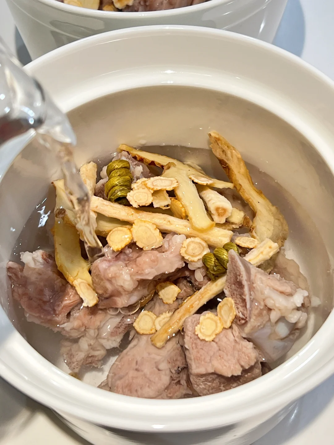 2️⃣除海参外的所有食材放进炖盅,加清水至8分满,炖一个小时。