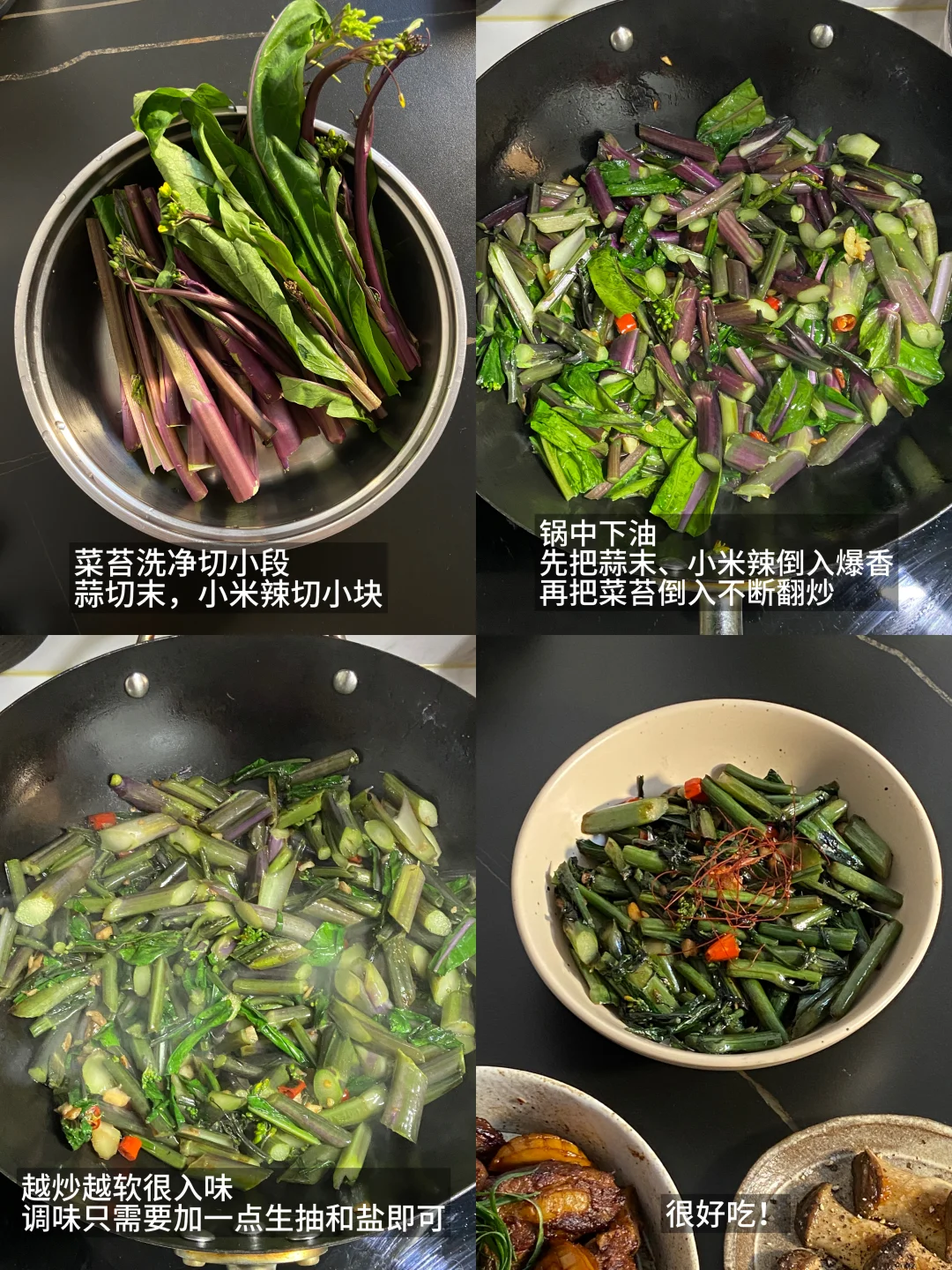 2)锅中下油,先把蒜末、小米辣倒入爆香,再把菜苔倒入不断翻炒,越炒越软很入味,调味只需要加一点生抽和盐即可