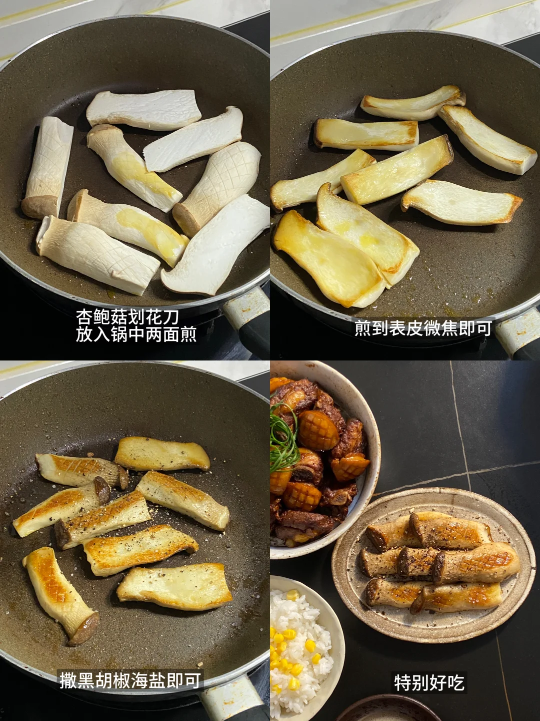 1)杏鲍菇划花刀,放锅中煎到两面焦黄即可,盛出撒黑胡椒海盐