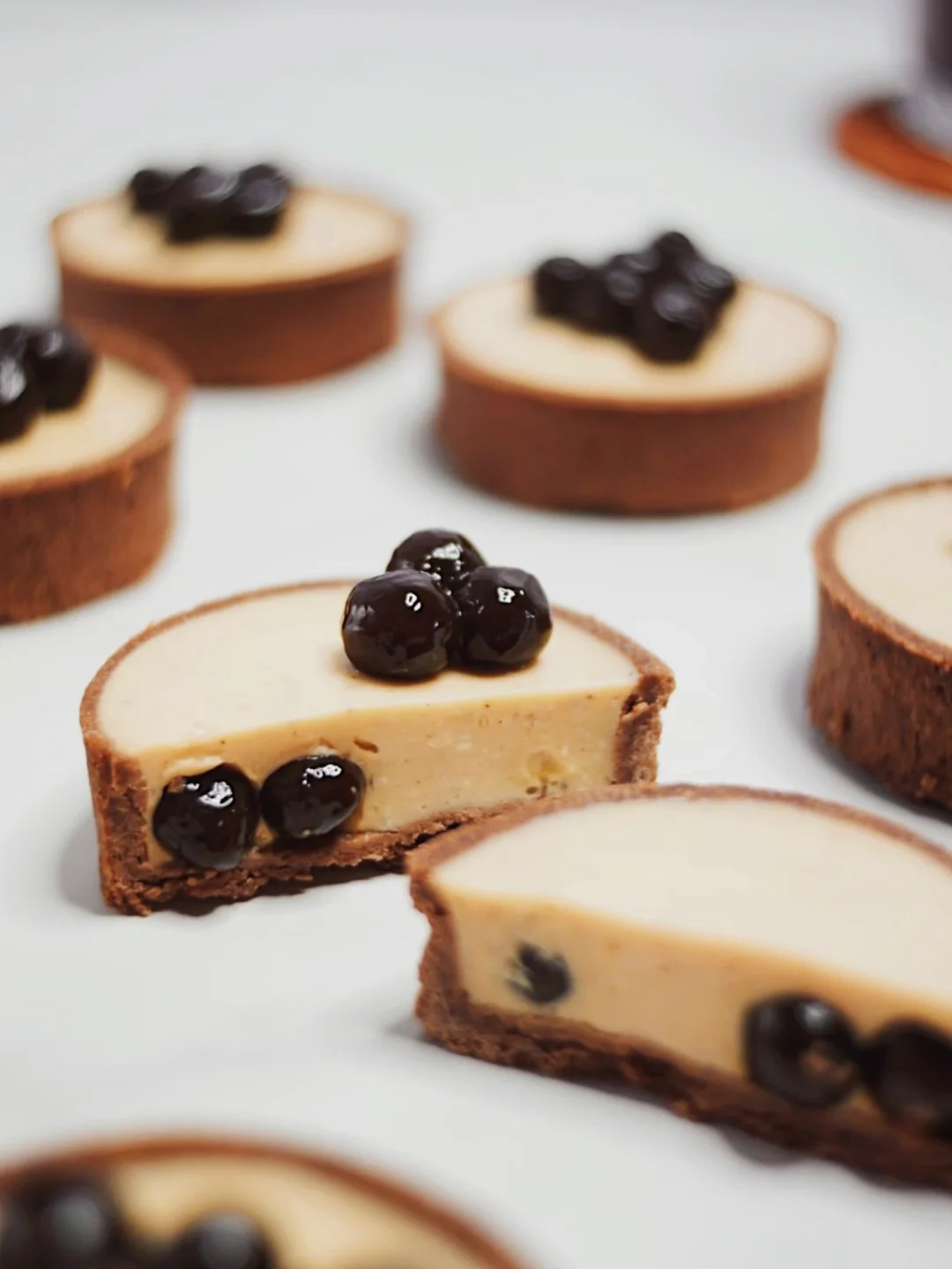 奶油奶酪50g|淡奶油50g|细砂糖15g|红茶2g|牛奶50g|吉利丁片5g|黑糖珍珠40g|可可挞壳10个