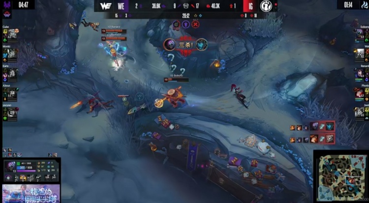 [13:30]WE上路带线被开,虽然第一时间人数优势先行秒掉Soboro贾克斯,但是iG五人齐前后包夹反打成功!最终Wei潘森跳大留到了Karis发条,Photic女枪双杀,这波iG打出2换4!