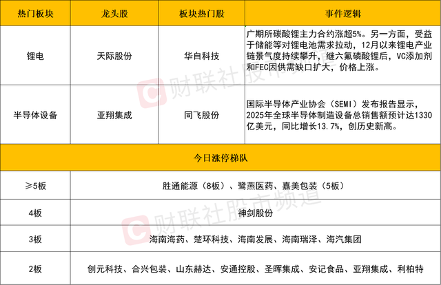 锂电池板块全天强势,天际股份、滨海能源涨停,华自科技、华盛锂电、天赐材料、鹏辉能源、石大胜华、海科新源等涨幅居前。消息面上,广期所碳酸锂主力合约涨超5%。另一方面,受益于储能等对锂电池需求拉动,12月以来锂电产业链景气度持续攀升,继六氟磷酸锂后,VC添加剂和FEC因供需缺口扩大,价格上涨。此外,正极、隔膜、负极等环节原材料价格也拉升。