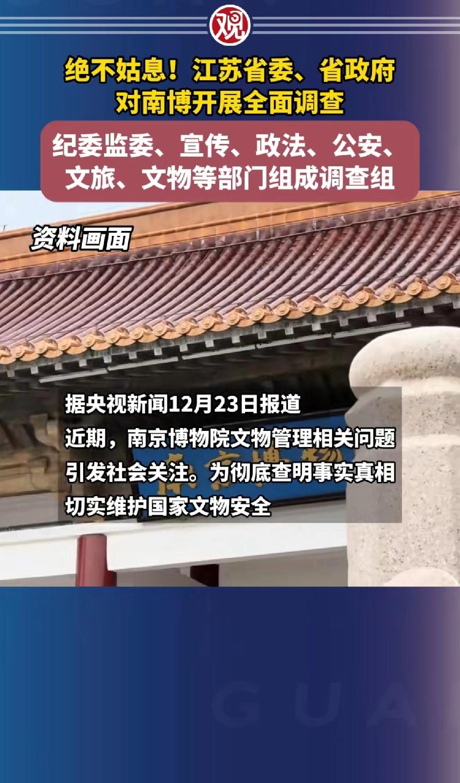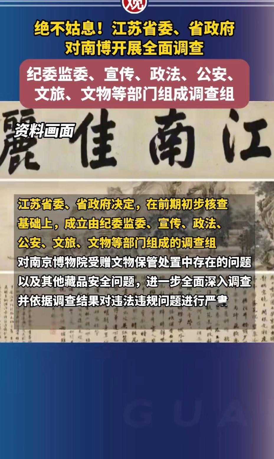 绝不姑息!江苏省委、省政府对南博开展全面调查!南京博物院文物管理问题闹得沸沸扬扬! 先是退休员工实名举报前院长,这事儿在网上掀起了不小的波澜。 12月23日,“新华日报”消息称,江苏省委、省政府决定在前期初核基础上,成立多部门联合调查组,对南博受赠文物保管处置及其他藏品安全问题全面深入调查,违法违规行为将严肃处理,绝不姑息,调查结果也会及时公布。 现在全国网友都在留意这件事,都好奇名贵的藏品到底去哪了? 还是拍卖会上8800万的藏品是怎么上的拍卖会? 前馆长被退休员工实名举报……一系列抓马的事,都等着最后的水落石出。 国家文物局也成立工作组核查。举报人从2010年就开始举报却没收到有效反馈。希望这次调查能水落石出,给公众一个交代,守护好国家文物安全。 这次事件不是网络发酵,也许还得不到重视。