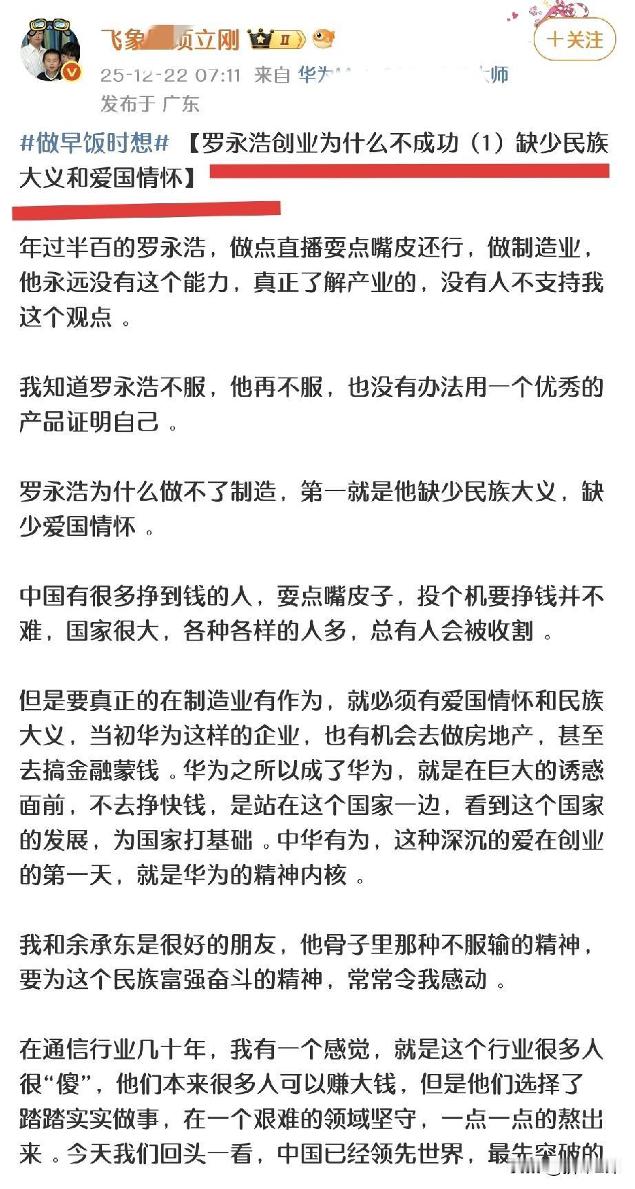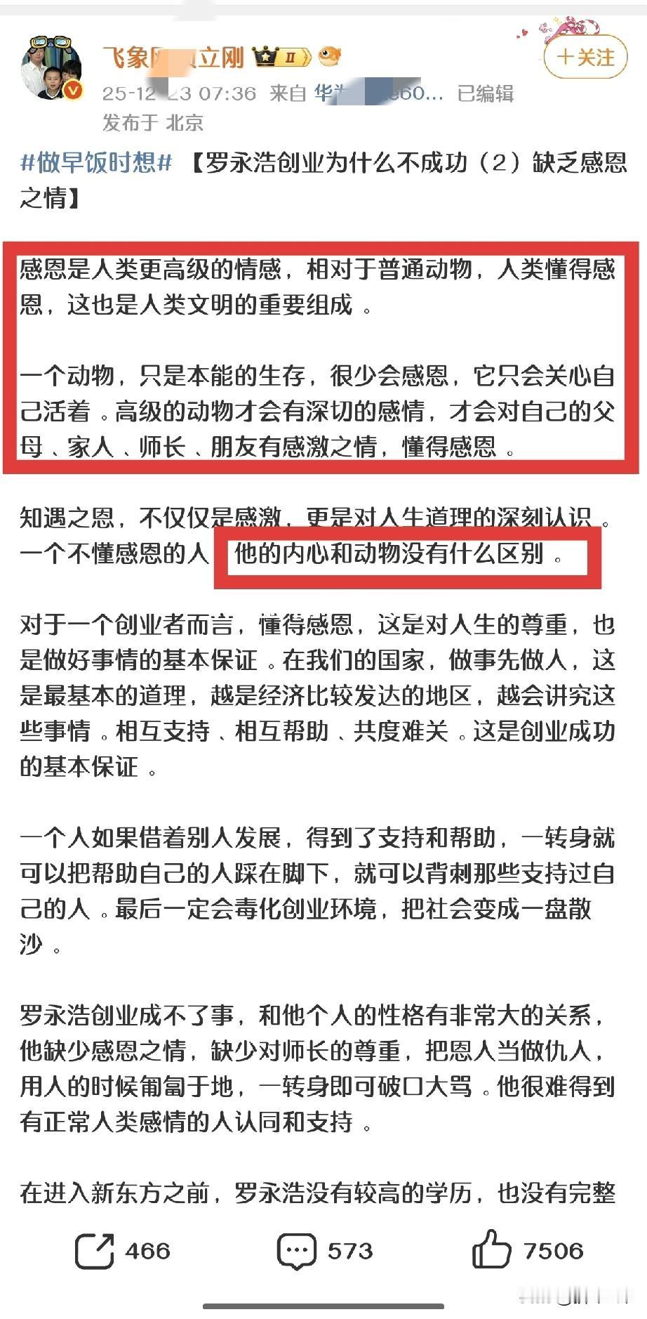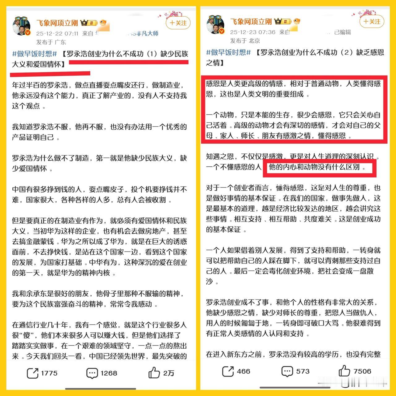 项立刚 根本停不下来😎继续连发两条动态 【罗永浩有一天如果被封和我无关】 【罗创业为什么不成功(2)缺乏感恩】,动物才不会感恩... 真狠呐~直接把老罗摆放到动物行列,简直不忍直视🙈🙈 估计老罗做梦都想不到,这辈子还能遇上一个比自己还能喷的 项立刚😂 自老罗回应“智樟”后已经闭嘴,项却揪住他不放了,追着怼,追着“锤”🔨 👀👀👀👀 看项立刚的这两天动态,就像每天一更的热播连续剧一样精彩 12月22日 【罗永浩创业为什么不成功(1)缺少民族大义和爱国情怀】 12月23日 【罗永浩创业为什么不成功(2)缺乏感恩之情】 看这架势,是真的要把罗写成一本书 这一回,罗该怎么去收场? (取材:微博)