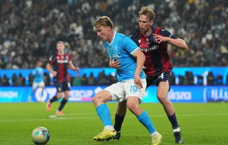 意超杯-内雷斯双响那不勒斯2-0博洛尼亚 队史第三次夺冠 意大利超级杯决赛,那不勒斯在沙特国王大学体育场对阵博洛尼亚。在此前的半决赛,两队分别淘汰了AC米兰和国际米兰。上半场,埃尔马斯错失良机,内雷斯世界波破僵。下半场,内雷斯再入一球上演梅开二度。最终,那不勒斯2-0击败博洛尼亚,时隔十年再次夺得意大利超级杯冠军,也是队史第三次问鼎该项赛事。意大利超级杯半决赛,那不勒斯2-0淘汰AC米兰,博洛尼亚则是通过点球大战总比分4-3击败国际米兰。决赛开始。第6分钟,坎比亚吉在禁区内倒地,但裁判没有表示。第7分钟,霍伊伦中圈附近送出直塞,内雷斯得球后一路推进至禁区内,随后的打门被回防的球员封堵。第11分钟,麦克托米奈在前场送出一记直塞,埃尔马斯在禁区左侧得球,小角度射门打偏了。第16分钟,埃尔马斯外围一脚远射,打得太正,皮球直接被门将没收。第32分钟,麦克托米奈一脚似传似射,皮球被门将扑出。第36分钟,那不勒斯在前场的连续配合,内雷斯送出直塞,斯皮纳佐拉拿到单刀机会,他的射门被门将扑了一下,随后皮球被防守球员在门线附近解围。