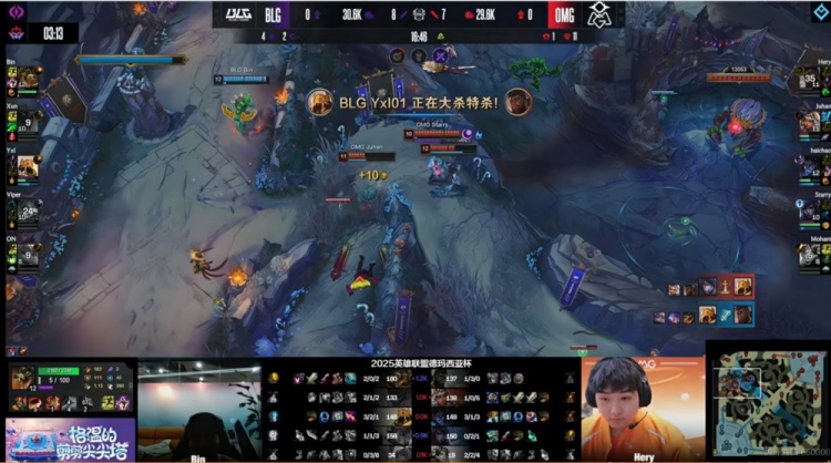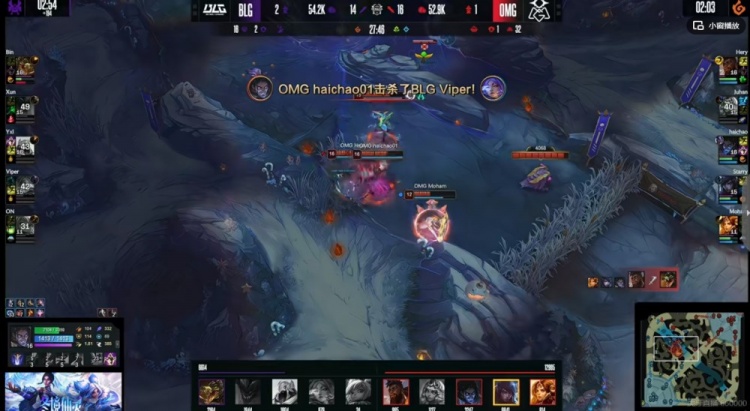 [27:34]BLG开打大龙,Juhan琪亚娜推大先手,自己倒下但是haichao塞拉斯偷到了墨菲特大招直接创飞了Viper芸阿娜!Yxl沙皇也被OMG下路组解决!残局没人管的Starry厄斐琉斯输出拉满!这波BLG虽然拿下大龙!但是Starry厄斐琉斯三杀,OMG打出1换5团灭BLG!反超了经济!