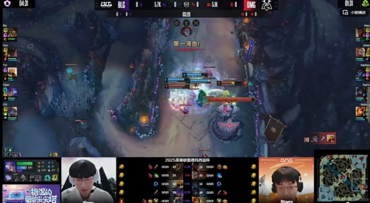 [3:29]Juhan琪亚娜gank中路,帮助haichao塞拉斯击杀掉Yxl沙皇拿到一血!同时BLG下路三人越塔,Starry厄斐琉斯被强杀!Xun墨菲特收下击杀!1换1!