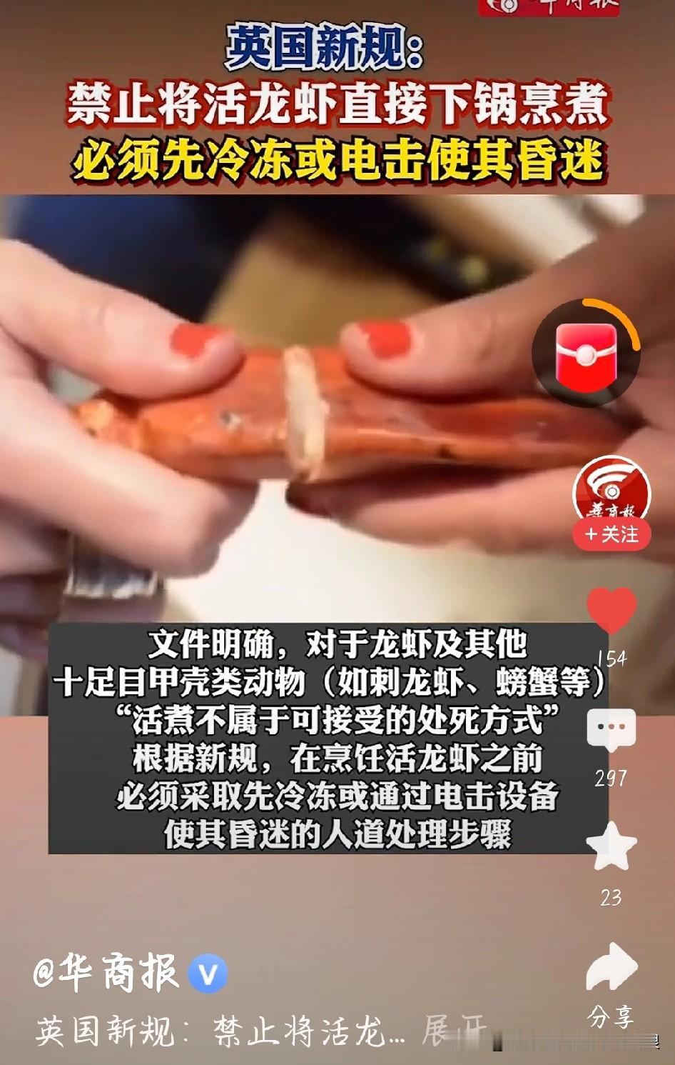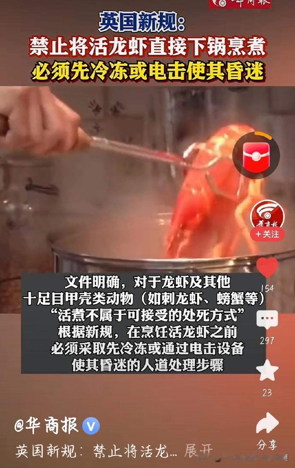 英国出新规:活煮龙虾违法!违者罚款还坐牢? 英国这波操作炸锅了!以后在英国,把活龙虾直接丢沸水烹煮就是犯法,螃蟹、皮皮虾这些也包含在内。 为啥禁?研究说龙虾能感知疼痛,活煮时要遭好几分钟罪。新规要求先冷冻麻醉或电击致昏,再下锅才合规,不管家里做还是餐厅卖,违者最高罚5万英镑或蹲6个月牢。 网友吵翻了!支持的喊文明进步,终于不折磨动物;反对的吐槽瞎折腾,活煮才够鲜,小餐馆买电击设备要花两万多,根本扛不住。 吃个龙虾还扯上法律,到底是人道还是多管闲事?你站哪边?你认为烹饪龙虾前应该先杀死它吗 英国禁止将活龙虾直接投入沸水烹煮 龙虾烹饪方法 龙虾禁令 澳洲活龙虾 伦敦龙虾 英国禁止活煮龙虾 动物福利争议, 图片截图于网络