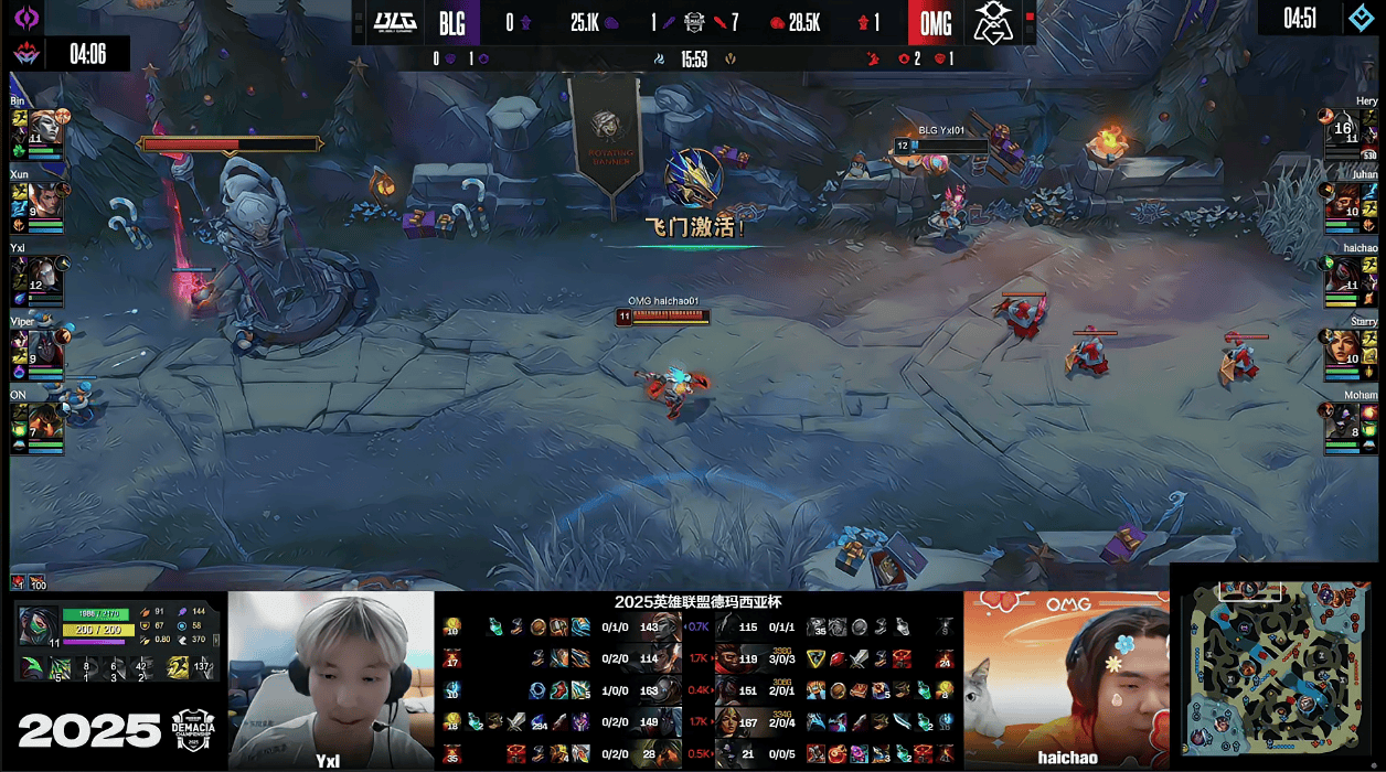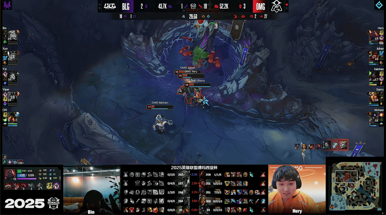 26分钟,OMG团战控制拉满瞬间融化BLG下路组合,Bin双拳难敌十手被集火击杀