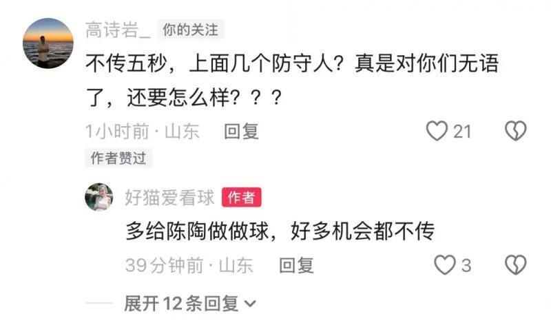 高诗岩给邱彪背锅 为最后一秒跟球迷掰扯,有谁会给他助威呢? 很多球迷错怪了高诗岩,最后一秒发界外球,他在场外,领先3分的深圳队5防四,甚至故意漏张旭,外教给的指令很明确,就是防住三分球,也就是多人围堵陈林坚、克里斯和高诗岩,1秒不紧张都难,高诗岩说不发就5秒违例,但球迷会听他的吗?他错在不一个吭声,反正球迷就看不惯他。 至于陈林坚三分球就出手一次,高诗岩自己7中3,怪他也没有错,至于之前防守三分球,让王浩然投进,其实邱彪的指挥和阵容安排问题很多,山东队末节其实很保守,对方玩得不管不顾,不赢球都没有天理,球迷吹毛求疵,难道不能吗?