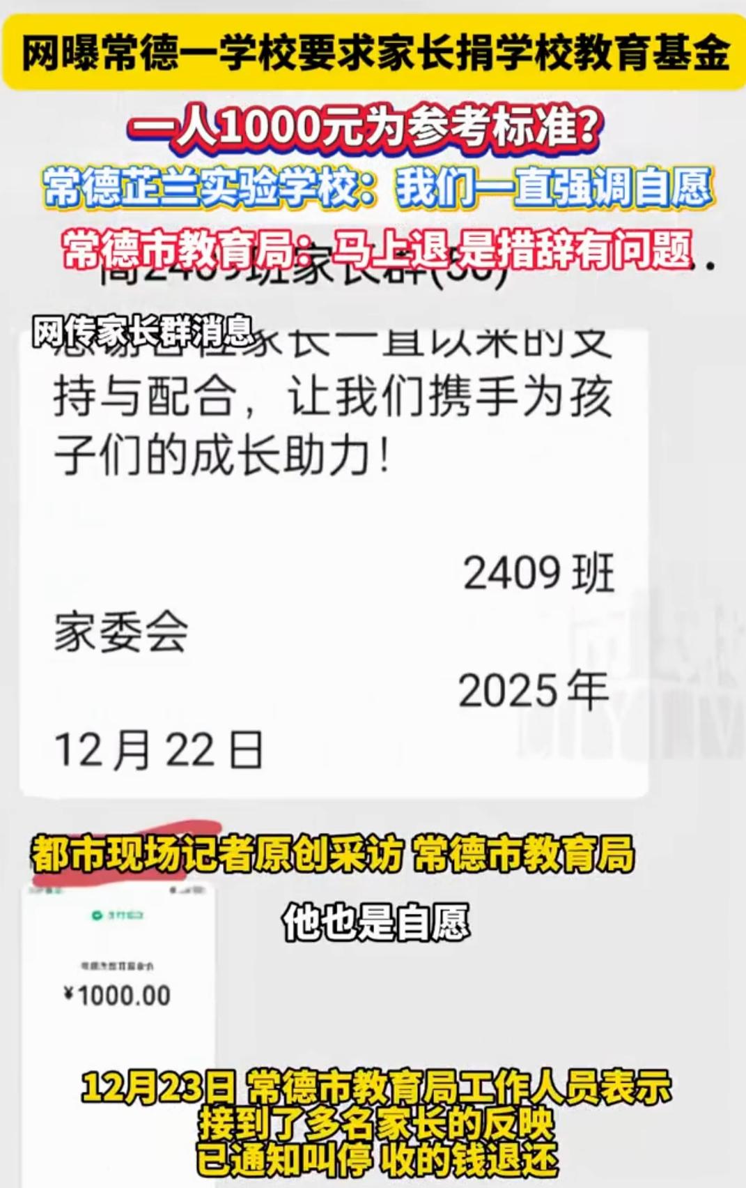 湖南公办校要求家长最低捐1000元?教育局紧急叫停并退款 12月22日晚,湖南常德芷兰实验学校家长群一则通知引发轩然大波。某班级家委会发文称“教育基金会捐款开始,每人不少于1000元”,还建议捐款金额可包含“985、211”图寓意,资金将用于晚自习开支、学生支出及优秀师生奖励 。有家长质疑“不捐怕孩子受区别对待”,询问能否不捐时,家委会回应“没强制但最好配合”,被网友吐槽为“隐形强制捐款”。 公开信息显示,该校2022年已转为公办学校,办学经费本应由财政保障。事件发酵后,学校回应称捐款“全程自愿,无强制要求”,否认校方主导千元捐款标准。但常德市教育局23日证实接到家长投诉,已紧急叫停该活动,要求全额退还已捐款项,解释争议源于“家委会公告措辞不当”,而非强制捐款。 这场风波迅速引发全网热议。有网友直言“公办校靠家长捐款维持运转,财政保障何在”,也有家长吐槽“别人家孩子优秀,要普通家庭掏腰包奖励”。支持学校方则认为,教育基金会已运行数年,初衷是改善教学条件,此次只是沟通失误。 依据《公益事业捐赠法》,捐赠应自愿无偿,禁止任何形式摊派 。公众更关心的是,公办校晚自习开支是否该纳入财政预算?家委会越界发布带强制色彩的通知,校方是否存在管理漏洞? 目前退款工作已启动,但事件暴露的公办校经费保障、家校边界模糊等问题仍值得深思。教育的本质是育人,而非变相募资,唯有守住自愿底线、做到经费透明,才能让家校信任不被“捐款争议”消耗。教育基金捐款榜