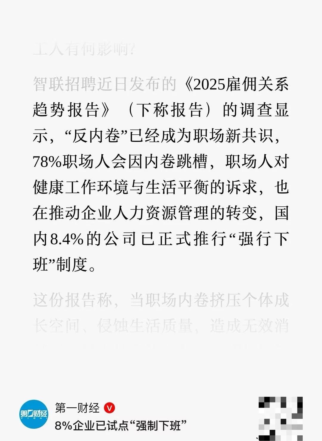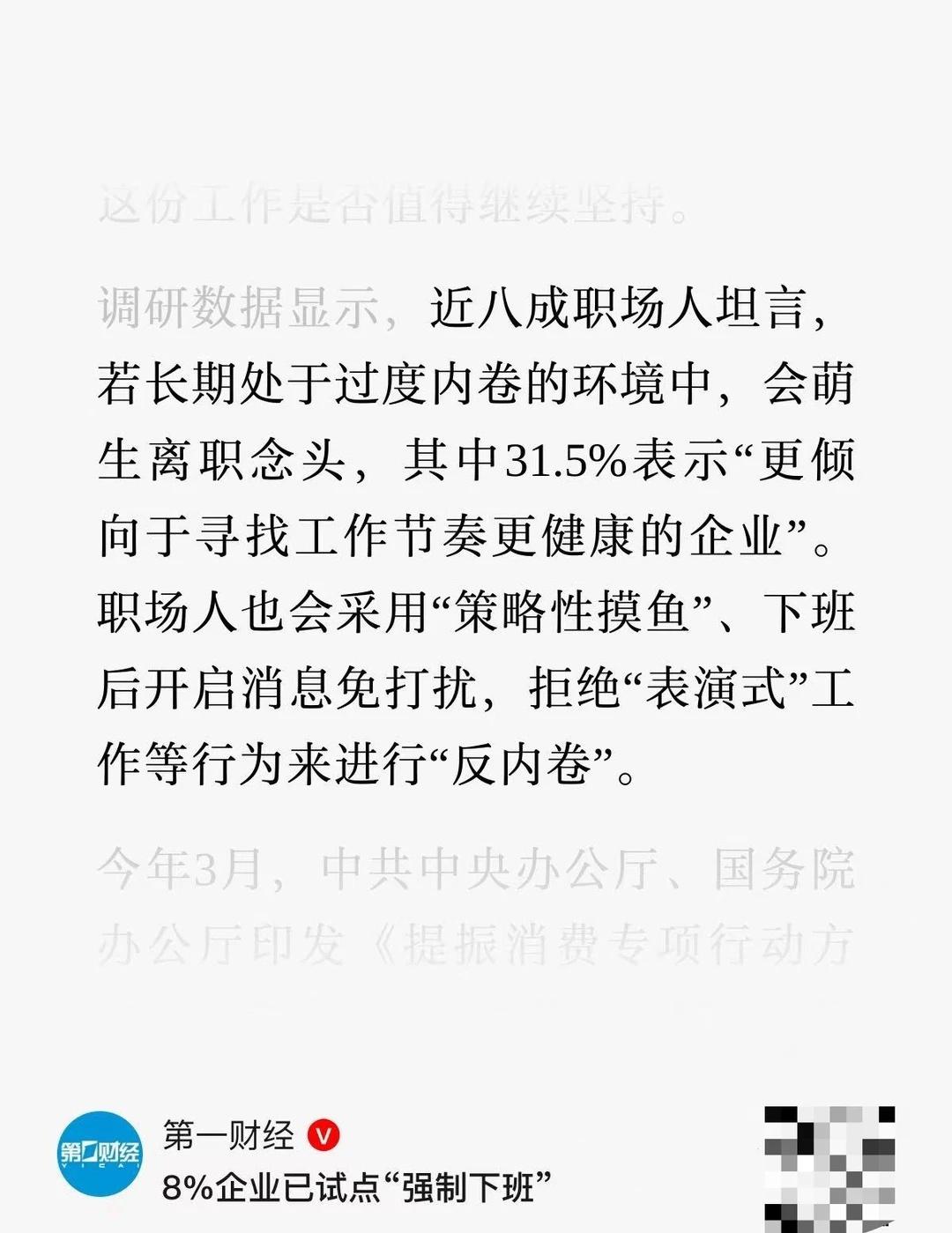 调查称8%企业已试点“强制下班” 某招聘平台调研显示,“反内卷”已经成为职场新共识,78%职场人会因内卷跳槽,职场人对健康工作环境与生活平衡的诉求,也在推动企业人力资源管理的转变,国内8.4%的公司已正式推行“强行下班”制度。 报告还显示,近八成职场人坦言,若长期处于过度内卷的环境中,会萌生离职念头,其中31.5%表示“更倾向于寻找工作节奏更健康的企业”。职场人也会采用“策略性摸鱼”、下班后开启消息免打扰,拒绝“表演式”工作等行为来进行“反内卷”。强制下班 反内卷 职场
