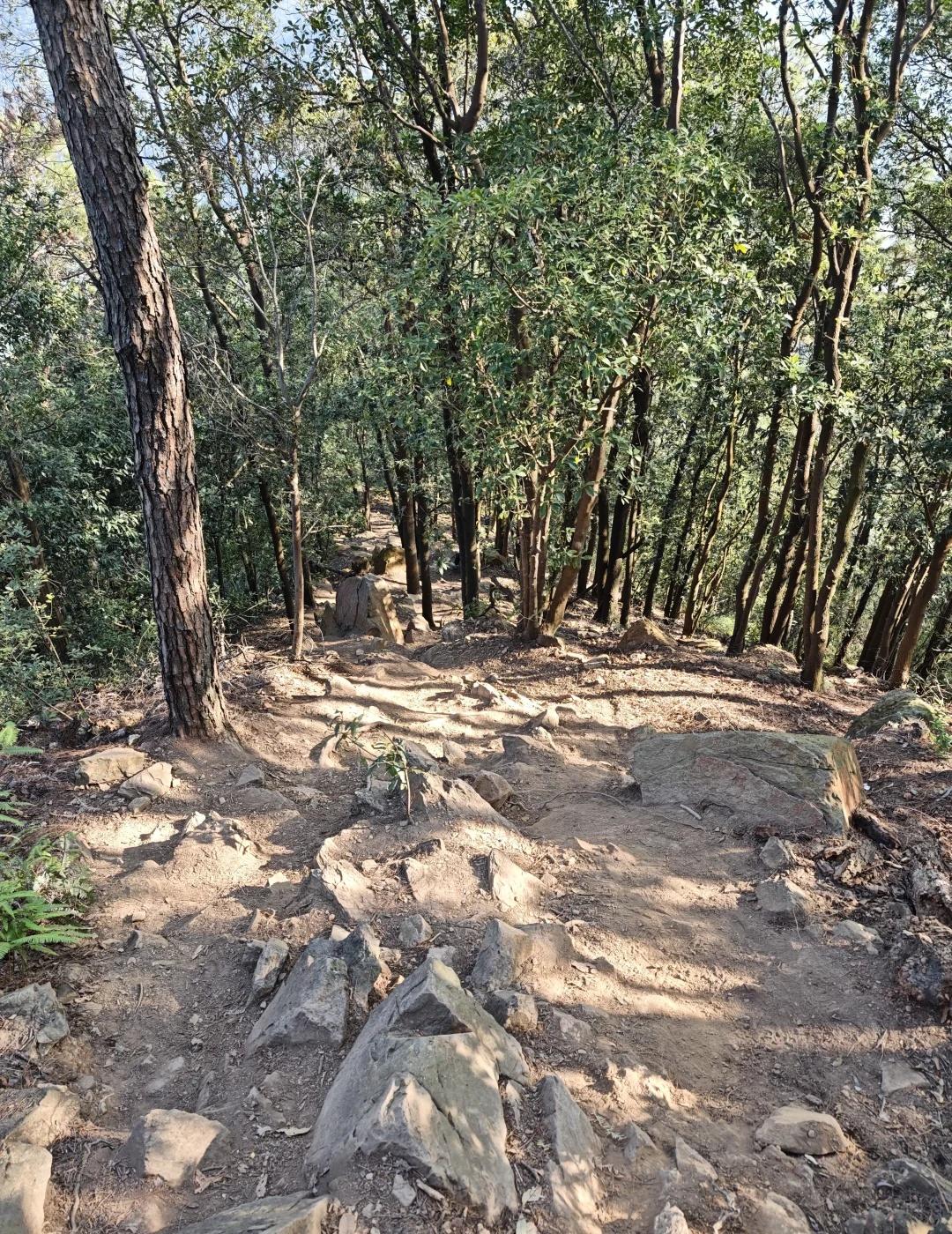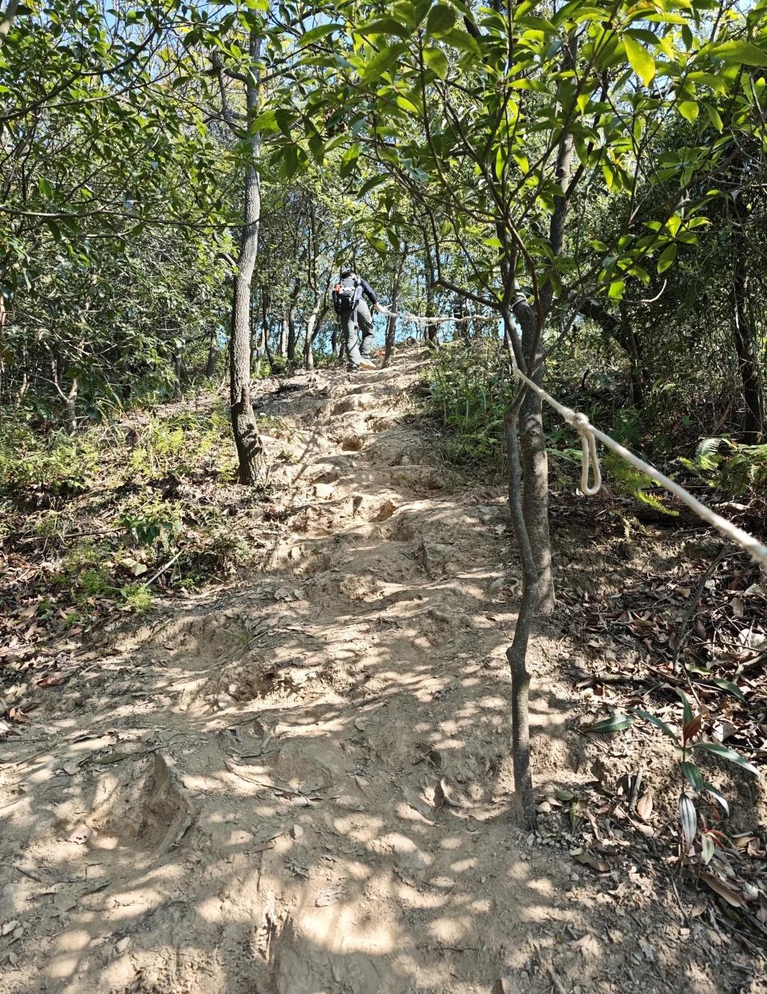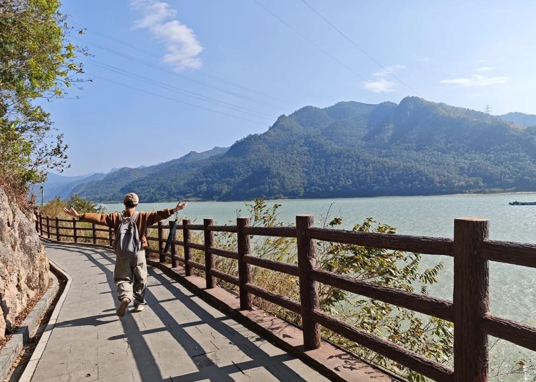 肇庆羚羊峡 广东版小三峡,西江在两山之间穿过,站在山上观看江面来往的船只,远处连绵起伏的山恋,让人流连忘返的美景。导航羚山涌入口停车场,车位挺多的,还免费停车。 物品准备:登山鞋、登山杖、根据天气状况选择防晒衣或冲锋衣,3瓶水以上(全程无补给,只有入口处有个小便利店),帽子,充饥食物 徒步体验:这次走的是羚羊峡古道小环线,全程12公里左右,爬升近800米。停好车往羚羊峡古道牌坊走,沿着江边栈道走几分钟,然后左转野路上山。进山后一直都是在爬升,有些坡度较陡,部分泥土坡较滑,而且没有遮挡,太阳暴晒流汗较多,夏天不建议来。大概半个小时到山脊线,可以休息一下。龙门顶之前的路都是一路爬升的,但没有刚上山的那段路陡,很少有下坡。山上的风景很美,好几处适合拍照打卡的,需注意安全。龙门顶是轨迹海拔最高点,然后是一路下坡,有些坡还比较陡。这个路线的特点很明显,爬升—下降—栈道。整体来说,难度不大,风景不错,值得推荐。如果带孩子的话,不太建议。一开始的爬坡是最难的,遇到有个孩子哭着要回家,还是逛逛江边的古道好了。徒步丈量世界