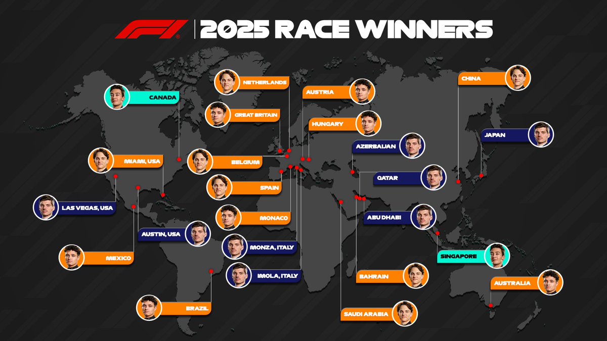 F1官方推特账号报道。本赛季各站冠军归属如何?我们已绘制出2025年各分站赛冠军分布图...#F1