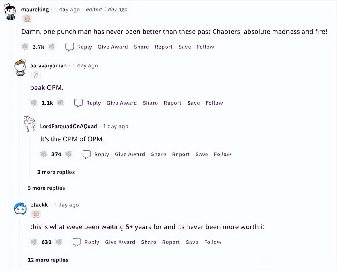 2015年播出的《一拳超人》第一季,在欧美漫画网站票选,就以47%得票率登顶最佳动画。今年更新的211话,虽然在国内评价不佳,但在X上被盛赞“bestchapter”,在Reddit上,一条“一拳超人从来没有像过去这几话这么精彩过!”的评论获得了3700个赞。