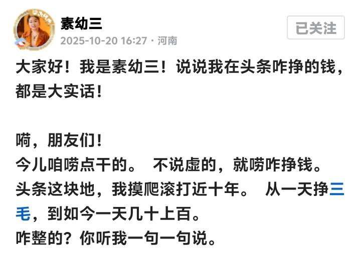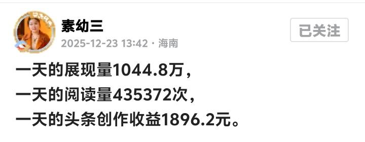 素老三日赚千元,洵哥日赚毛钱:头条创作者的冰与火之歌 当“素老三”单日收益1896元的截图刷屏时,无数人感到羡慕与不甘。那串数字如同一束强光,刺痛了许多人的心。然而在这光芒背后,有多少人正默默吞咽着现实的苦涩?洵哥在头条坚持了2449天,写文章是從25年1月25日开始的,至今天共298天去掉两次违规14天有1天木写共283,前5,6年只才有6分的收入,总阅读量仅40万,粉丝249人,总收入151.43元。昨日洵哥写下30篇文章,近2.5万字,收益却只有0.14元。这组冰冷的数据,仿佛一盆冷水,浇醒了许多人的“头条致富梦”。 平台上的确卧虎藏龙,但在虎啸龙吟之下,更多的是无声的挣扎。有人凭单篇爆款赚够一年生活费,也有人日更十年却难破百元门槛。这不仅是个人能力的差距,更是赛道选择、方法运用与运气成分的综合博弈。素老三的成功并非偶然,垂直的内容领域、持续的更新频率、精准的粉丝互动,缺一不可。但她的路径,未必适合每一个人。 洵哥的经历,才是大多数普通创作者的缩影。洵哥像一头老黄牛,埋头耕耘,木黑木白,却鲜见丰收。洵哥的文字或许不够惊艳,但每一篇都倾注了心血。当别人讨论“千次阅读单价”时,洵哥还会为他人的一个点赞而欣喜。这种坚持本身,已是一种值得尊敬的胜利。 头条就像一片汪洋大海,有人乘风破浪,有人沉潜暗涌。浪花永远只属于少数人,而大海深处,沉默才是常态。我们羡慕那些站在浪尖的人,却常常忘记他们也曾呛过水、熬过夜。素老三的干货经验值得学习,但洵哥那份日复一日的坚持,或许更让人动容。 在这个算法主宰流量的时代,内容的价值时而清晰时而模糊。一篇爆款可能源于一个热点,也可能只是算法的偶然青睐。但能够长久生存的创作者,依靠的往往不是运气,而是对内容的敬畏。他们把写作视为一种修行,一字一句,打磨时光。 洵哥的账号像一面镜子,照出了创作路上的孤独与坚韧。每天面对冰冷的阅读数据,洵哥依然选择打开文档继续书写。这份近乎执拗的坚持,恰恰是许多“爆款作者”早期都曾走过的路。没有前期的厚积,何来后来的薄发? 当我们仰望“素老三们”的高光收益时,不妨也看看“洵哥们”留下的足迹。他们的存在提醒着我们:成功从来不是一条直线。有人快一步,有人慢半拍,但时间终会奖励那些不曾放弃的人。 头条的江湖里,有人靠锋芒毕露一战成名,有人靠细水长流默默立足。素老三的攻略固然实用,但洵哥的日常才是更普遍的生活真相。每一分收益背后,都是时间与心力的交换。而那些尚未开花结果的日子,叫做扎根。 对洵哥而言,写作或许早已超越了收益本身的意义。那成为一种表达的习惯,一种与世界对话的方式。粉丝虽不多,但每一个都是真实的相遇;收益虽微薄,但每一笔都是诚实的回报。在这条漫长的路上,洵哥正以自己的节奏,走着许多人曾怀揣的初心。 素老三和洵哥,仿佛是头条生态的两极。一个展示了抵达巅峰的可能性,一个记录着平凡坚持的日常。前者让我们看到希望,后者让我们学会耐心。而真正的创作者,往往是在这两者之间寻找平衡——心怀远方,亦脚踏现实。 洵哥对这两位写作大咖的看法,或许只能仰视。在洵哥眼中,素幼三像一座灯塔,照亮了方向却遥不可及;而另一位隐形的“收益王者”素老三日赚一二千元,则如夜空中的星,知其存在却难觅踪迹。洵哥明白自己还在山脚下跋涉,有些人却早已抵达云端。这种差距不仅是数字的鸿沟,更是时间、天赋与机遇交织而成的壁垒。洵哥偶尔只能苦笑,但更多时候,是握紧手机,写下又一个明天。 (来源:素幼三)