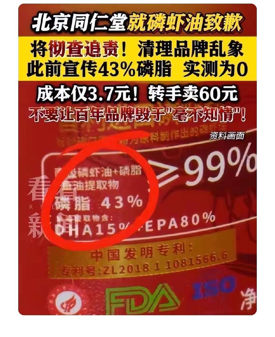 同仁堂又双叒造假了,真让人无语!就说这次被央视点名的“北京同仁堂 99% 高纯南极磷虾油”,上海市消保委检测发现,包装标着磷脂含量 43%,实测竟为 0,根本没磷虾油成分,就是劣质假货。 更离谱的是成本和售价差距。这假货出厂价 3 到 3.7 元一瓶,电商平台能炒到 60 元,翻了近 20 倍,专收割老人血汗钱。此前还有 2018 年蜂蜜事件、2021 年阿娇糕事件。同仁堂屡次造假还开满全国,国产老字号还能让人信任几个?真该好好整治整治了!