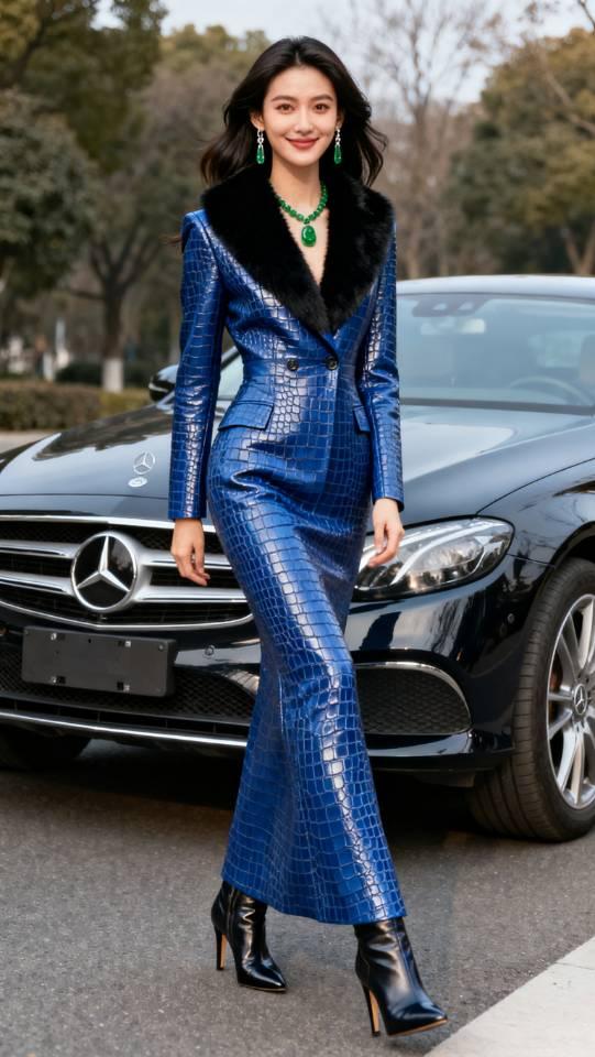 美女在小车旁展示西装连衣皮长裙。连衣裙 美女壁纸