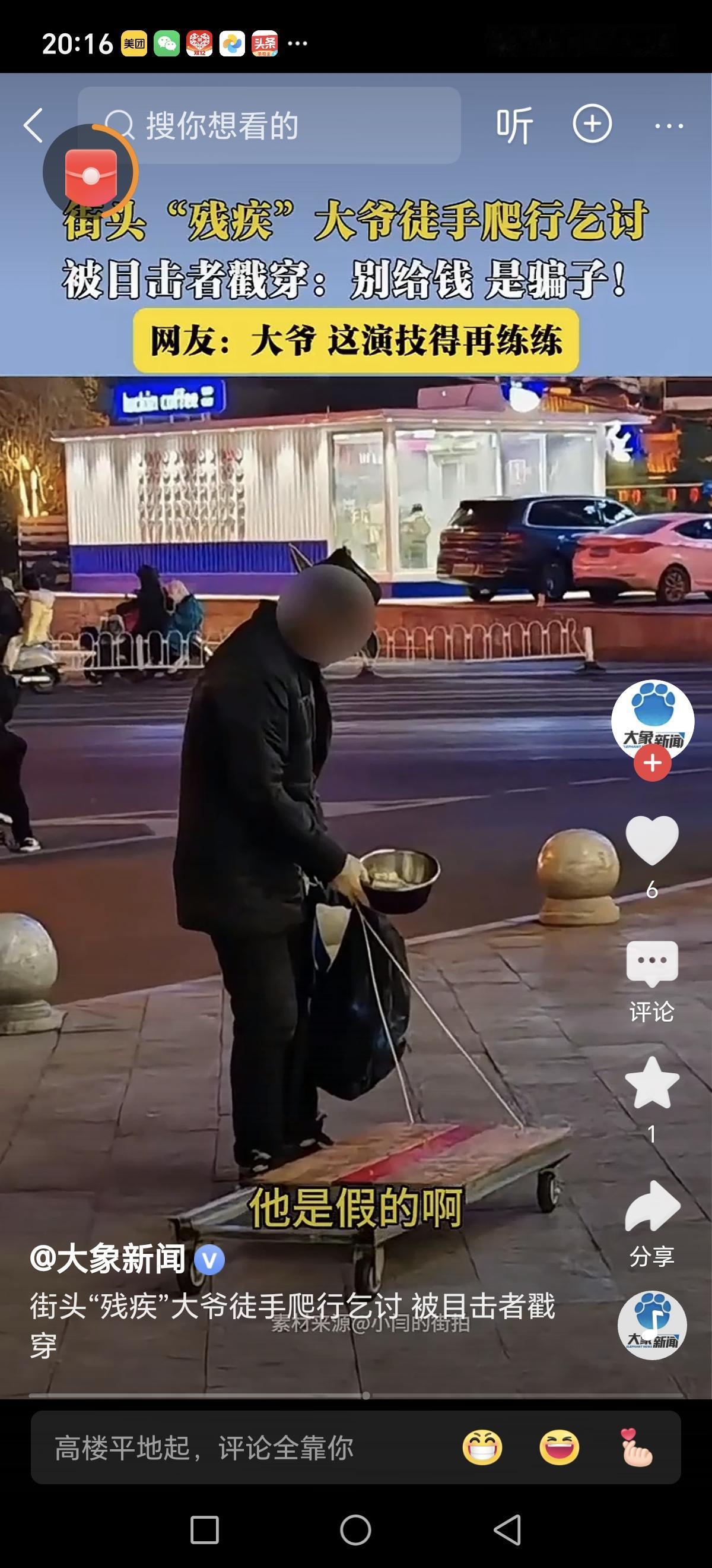 在这个快节奏、充满竞争的社会里,我们总以为自己看懂了“善良”与“欺骗”。然而,近日发生在某城市街头的一幕,却让无数人陷入深深的思考——一个“残疾”大爷的乞讨背后,隐藏着怎样的真相?这件事像一面镜子,照出了人性复杂的一面,也让我们不得不反问:我们看待弱者的眼光,是否还停留在偏见与偏执之中? 事情的起因很简单:有人在街头偶遇一位自称“残疾”的大爷,他动作蹒跚,面带无助,乞讨的场景令人心生怜悯。路人们纷纷投去善意的目光,有的递上零钱,有的搭话安慰。可是,就在大家以为这是一个值得同情的故事时,有细心的市民发现了一些破绽:那位大爷的“残疾”似乎并不完全真实——他在某个瞬间的动作略显僵硬,甚至有人拍下了他躺在地上偷偷整理衣物的画面。 这一幕瞬间被曝光,网友们议论纷纷:到底是真残还是假残?有人愤怒指责“假善良”的人性阴暗,也有人理性分析:也许有人只是为了生存而采取不同的方式。更有人站出来为“残疾”大爷辩护,强调:无论真伪,行善的心都值得尊重——毕竟,街头的苦难与善意,远比一场“真伪”之争更加复杂。 这个事件折射出社会中一个深层次的问题:我们是否还以偏概全,用标签定义一个人?面对弱者,我们是否太快用“欺骗”来贴标签,而忽视了背后那份可能的苦难与无奈?或许,这正是我们需要反思的:善意的边界在哪里?我们是否能用更多的理解去看待那些身处困境的人,而不仅仅是用“真假”来评判他们? 同时,也让我们意识到,善与恶、真与假,往往并非如此黑白分明。这个社会充满了灰色地带,每一个“乞讨者”的背后,都可能藏着一段难以言说的故事。我们不能因为一时的怀疑,就否定了所有的善意。相反,正是这些“疑问”,促使我们更加理性地看待每一个需要帮助的人,学会用心去理解他们的困境,而不是一味贴标签、戳穿。 或许,生活本就是一场充满不确定的考验。我们每个人,都在用自己的方式,探索善良的意义。面对“残疾”大爷的故事,让我们学会更多的宽容与思考。因为,真正的善良,不在于你是否相信,而在于你是否愿意用心去感受,用行动去温暖这个世界。毕竟,善意不会因为一场“真假”的闹剧而消失,它像一盏灯,照亮我们前行的路。刺痛人心的真相 社会真实写照
