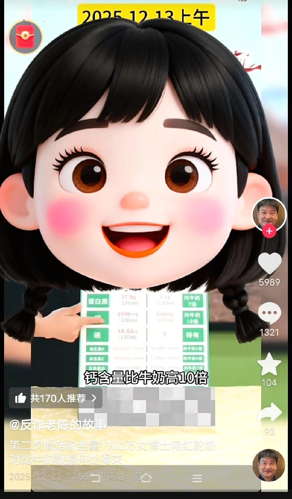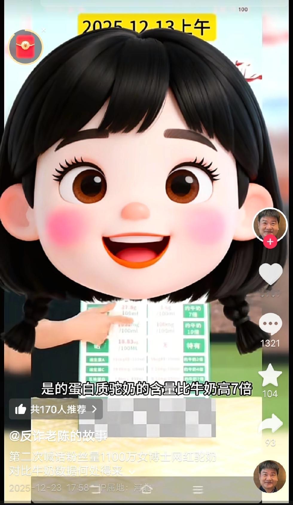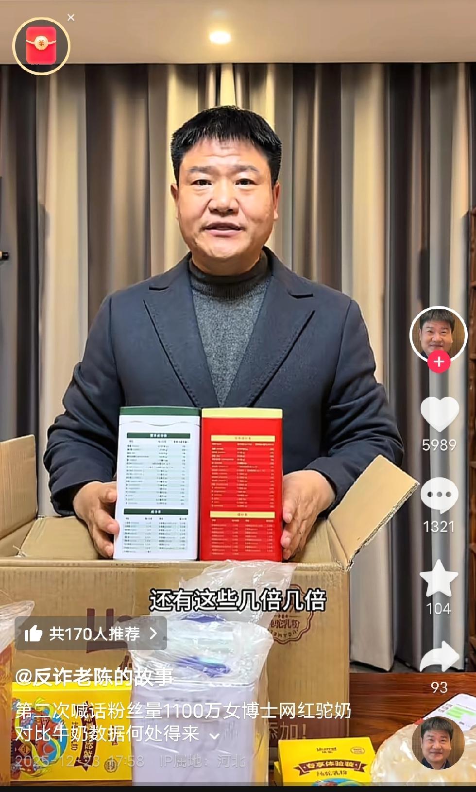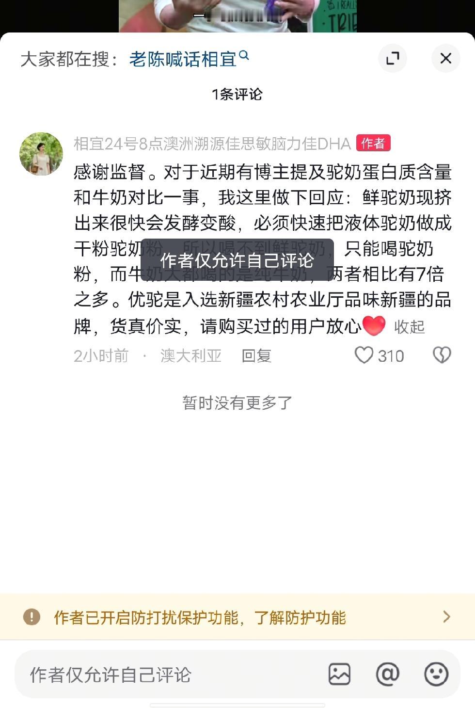 老陈向拥有1100万粉丝的女博士网红主播喊话,真是奇怪了,老陈每次向主播喊话,对方几乎都会立刻关闭评论。这样的主播还值得信任吗?为何一出现问题就关闭评论,究竟怕什么呢? 老陈质疑蛋白质驼奶的含量比牛奶高7倍、钙含量比牛奶高10倍这一说法,数据是否真实,来源又在哪里? 那一堆几倍几倍的表述,是否涉及虚假宣传、夸大宣传? 这位千万级主播在新视频里做了解释,但解释得让人一头雾水。