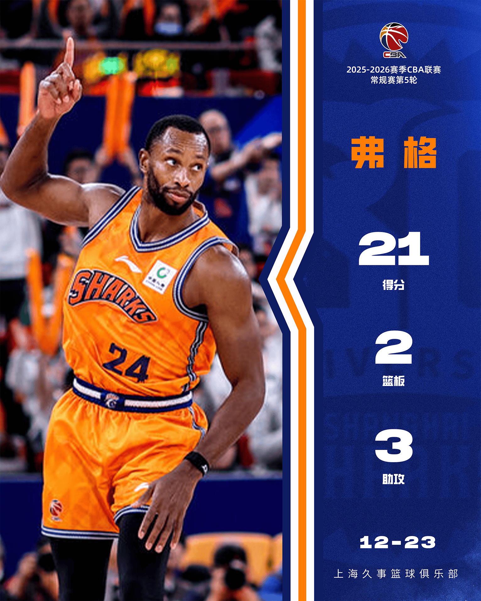赛后,上海男篮官方分享弗格数据海报,并配文:在今晚对阵浙江稠州金租的比赛中,我鲨外援弗格发挥出色,他全场出战24分13秒,命中4记三分,斩获21分2篮板3助攻2盖帽!掌声送给弗格!继续加油!