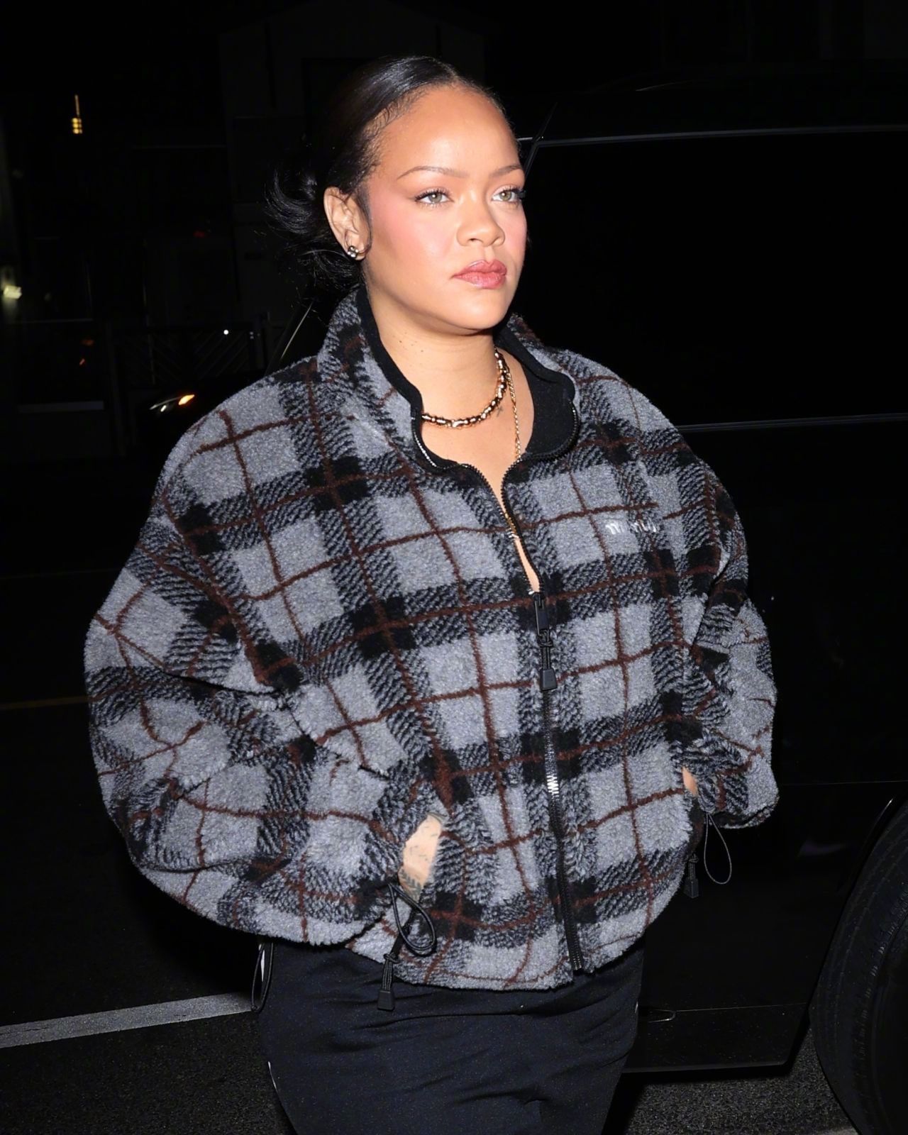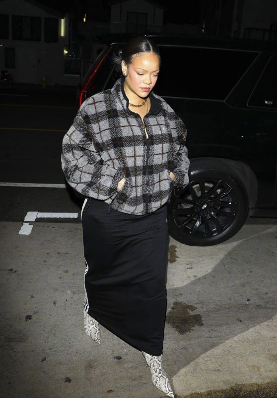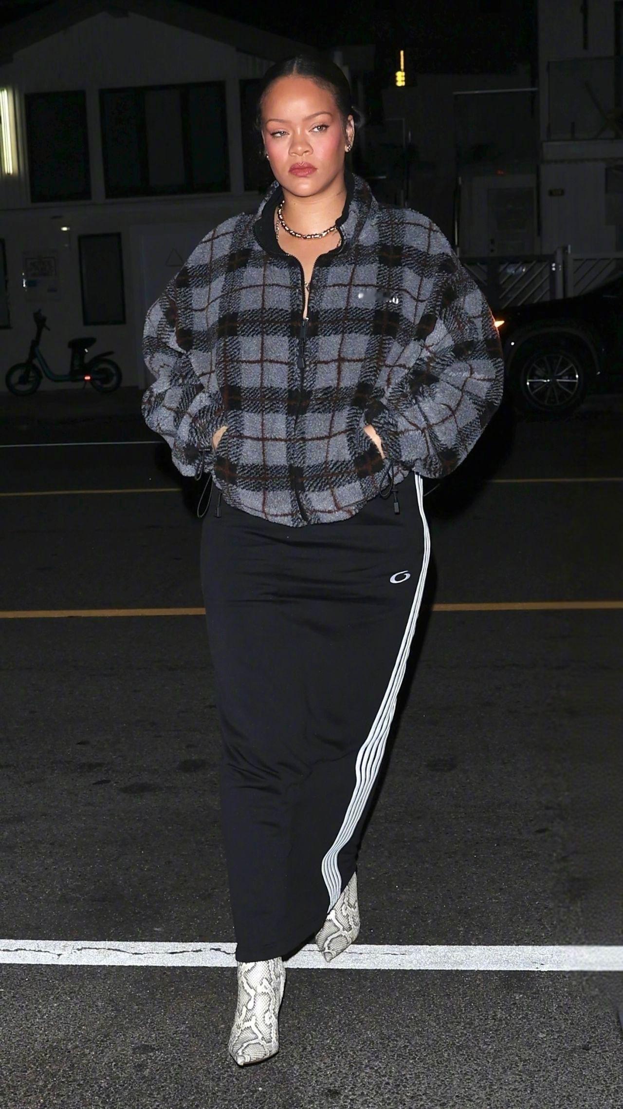 三胎辣妈蕾哈娜 又现身圣莫尼卡的自家后食堂-Giorgio Baldi餐厅了,身穿Miu Miu 格纹外套,脚踩Amina Muaddi 长靴。米拉服饰解析