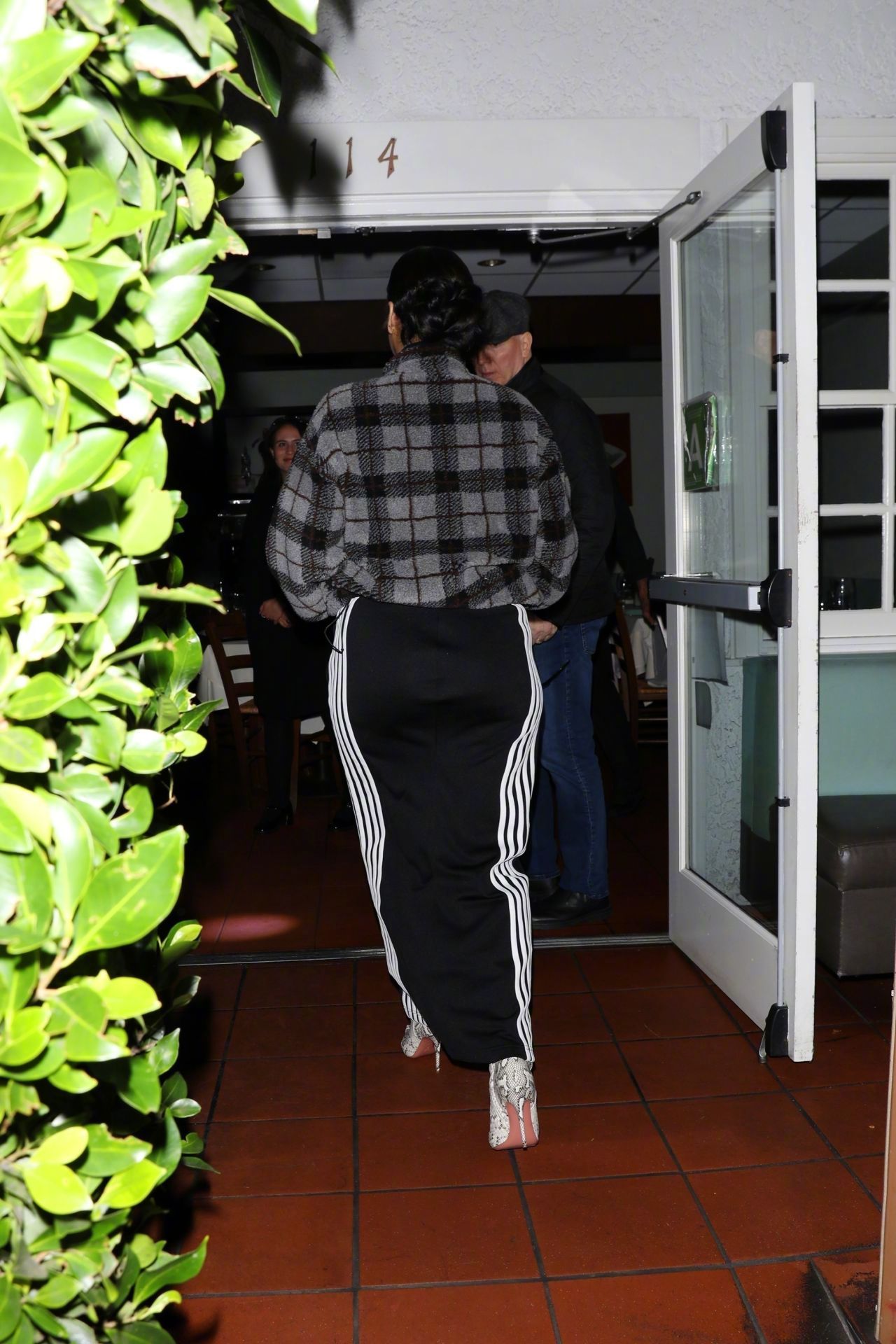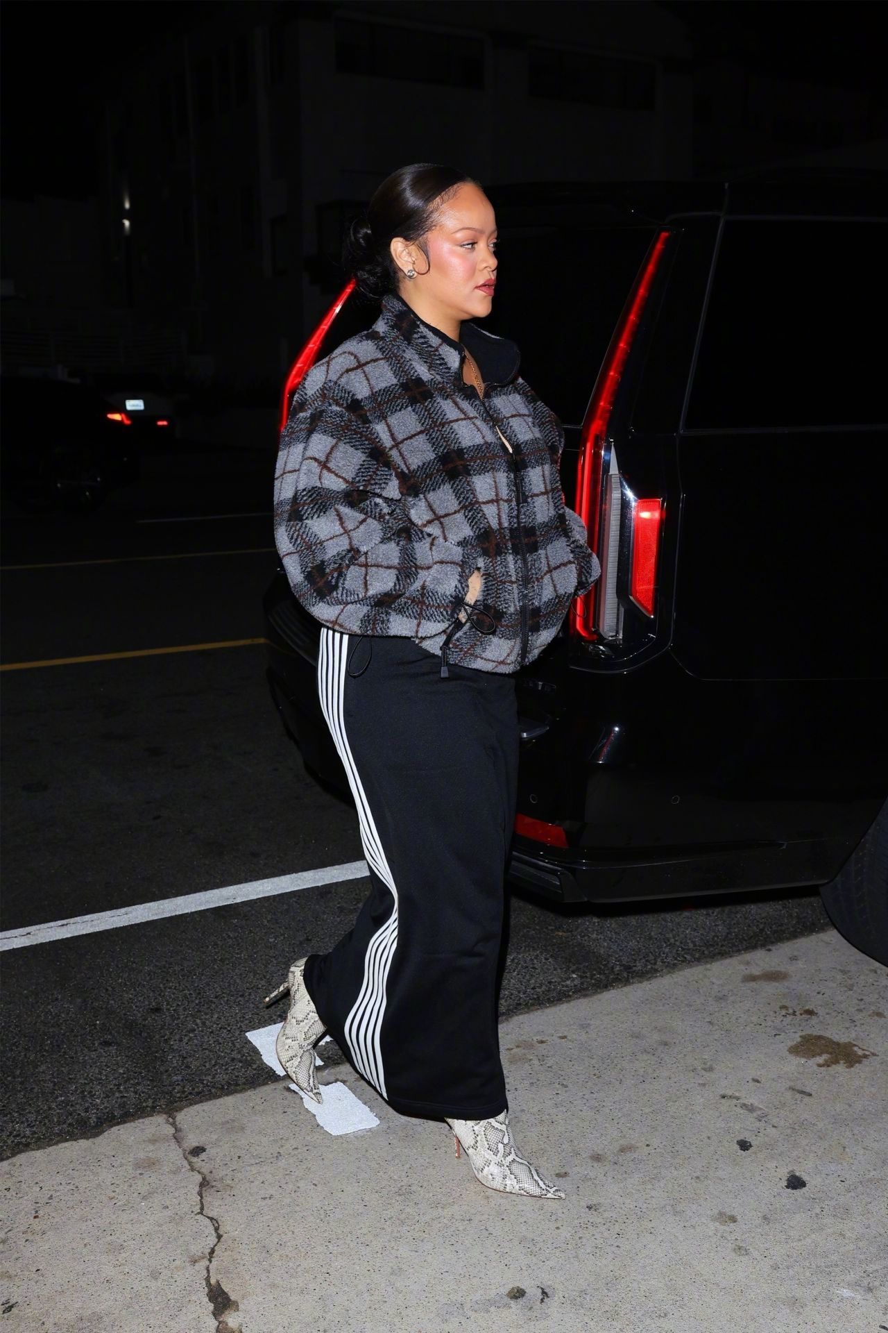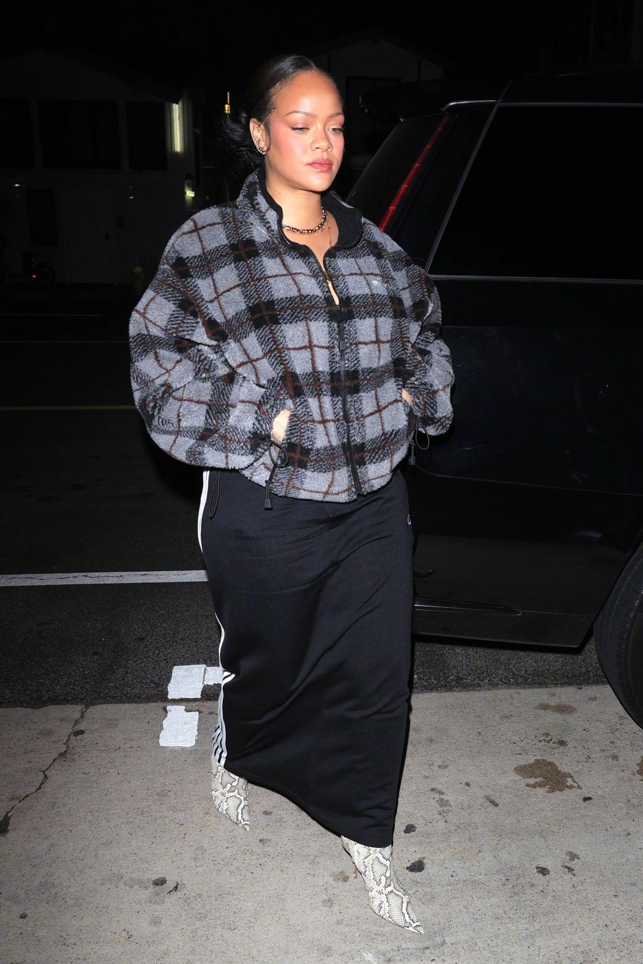 三胎辣妈蕾哈娜 又现身圣莫尼卡的自家后食堂-Giorgio Baldi餐厅了,身穿Miu Miu 格纹外套,脚踩Amina Muaddi 长靴。米拉服饰解析