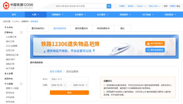 “12306”APP/官网登记查找,乘客打开“12306”APP,进入首页“温馨服务”板块,选择“遗失物品查找”,绑定乘车信息后,填写个人联系方式、遗失地点(如XX车次XX车厢XX座位旁、XX车站安检处等)、物品特征(颜色、大小、内含物品等,可上传物品照片),提交后可通过页面右上角“进度查询”跟进查找情况。
