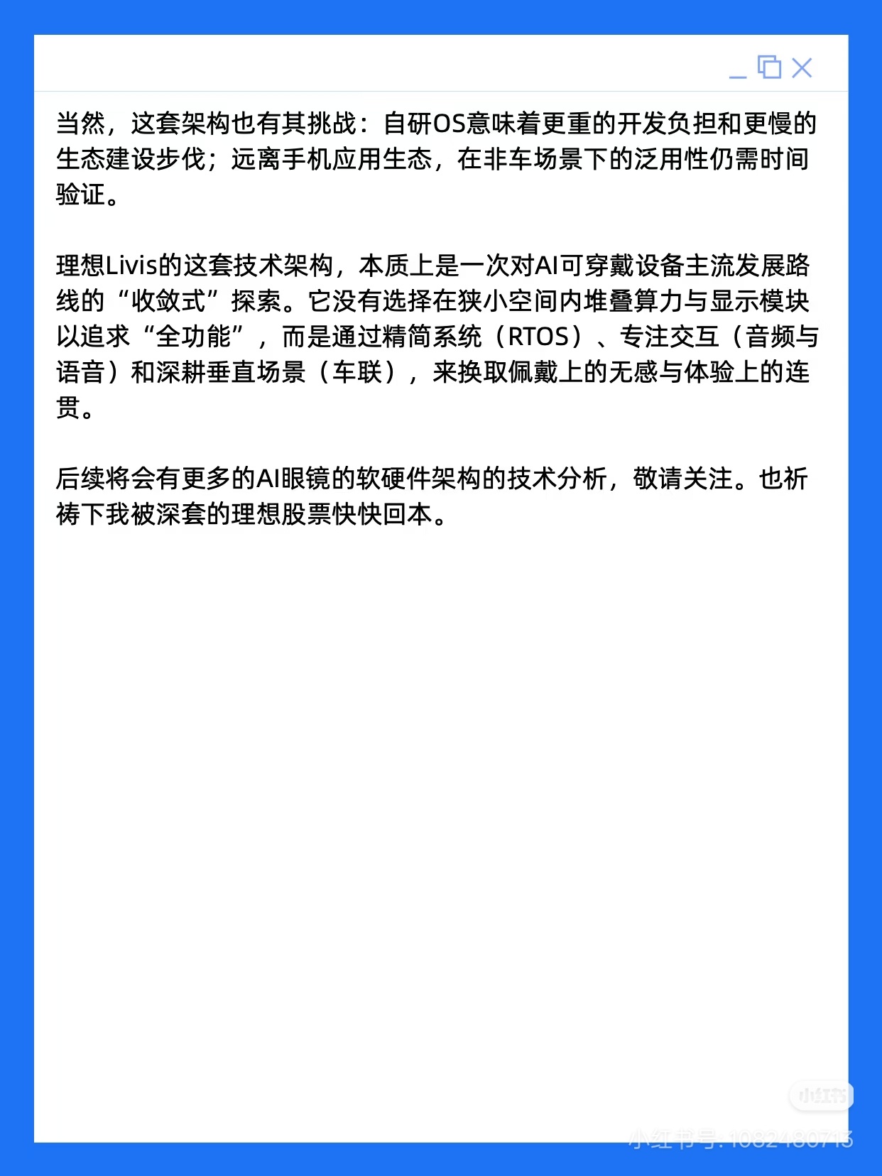 小红书发现了一个博主对理想AI眼镜-Livis的架构分析,我觉得分析的挺好,分享给大家看看!(不能保证所有分析的正确性)理想同学理想同学