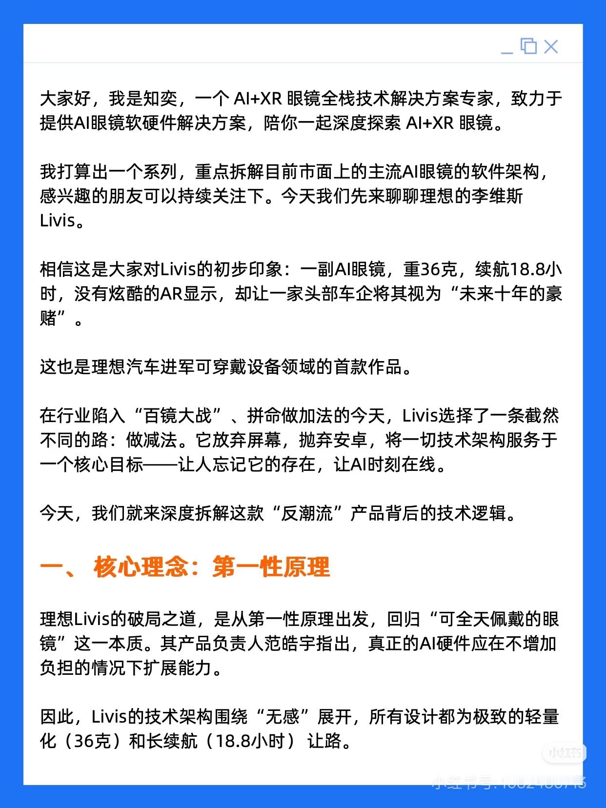 小红书发现了一个博主对理想AI眼镜-Livis的架构分析,我觉得分析的挺好,分享