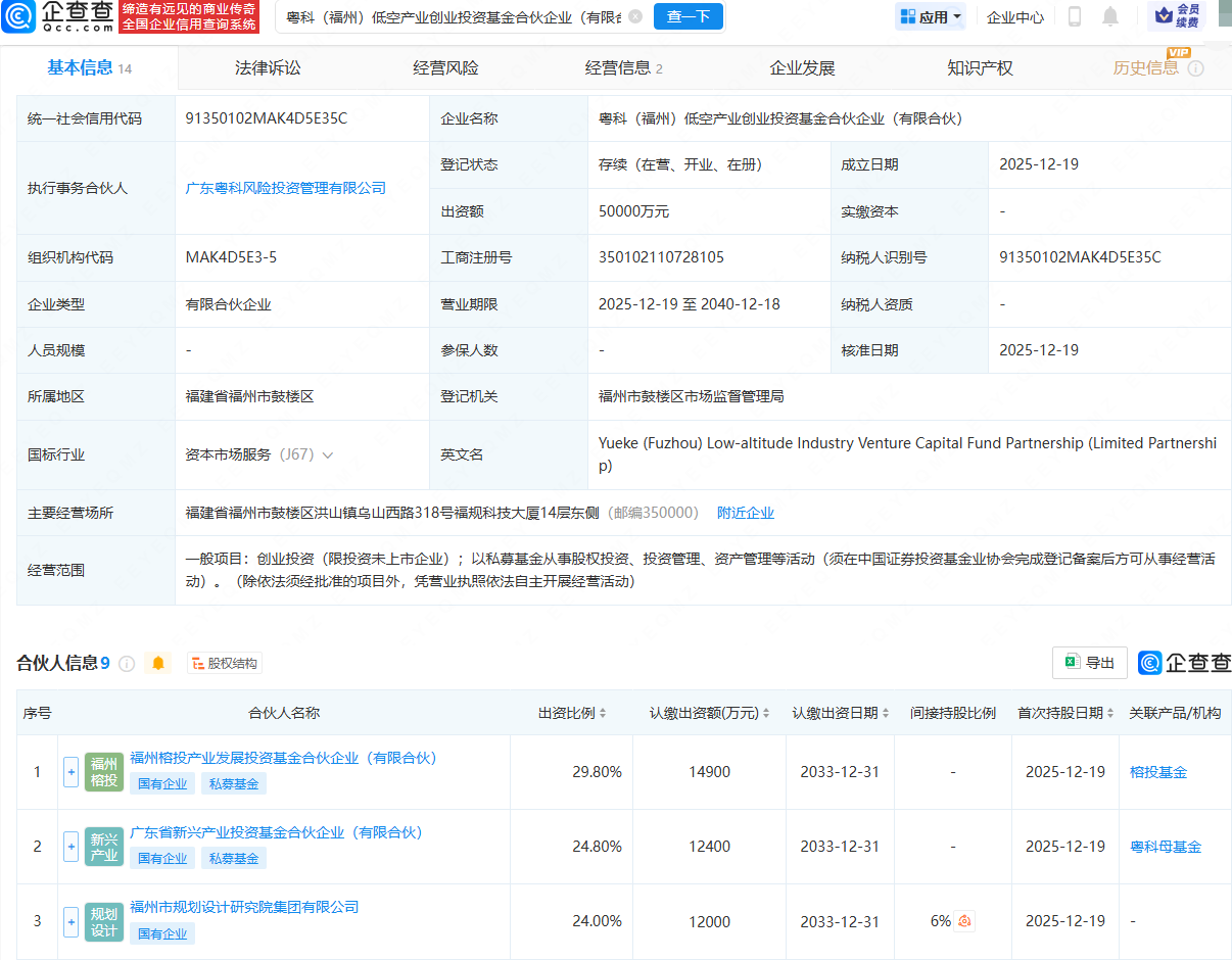 企查查APP显示,近日,粤科(福州)低空产业创业投资基金合伙企业(有限合伙)成立,出资额5亿元,经营范围包含:创业投资(限投资未上市企业);以私募基金从事股权投资、投资管理、资产管理等活动。企查查股权穿透显示,该合伙企业由福州榕投产业发展投资基金合伙企业(有限合伙)、广东省新兴产业投资基金合伙企业(有限合伙)等共同持股。