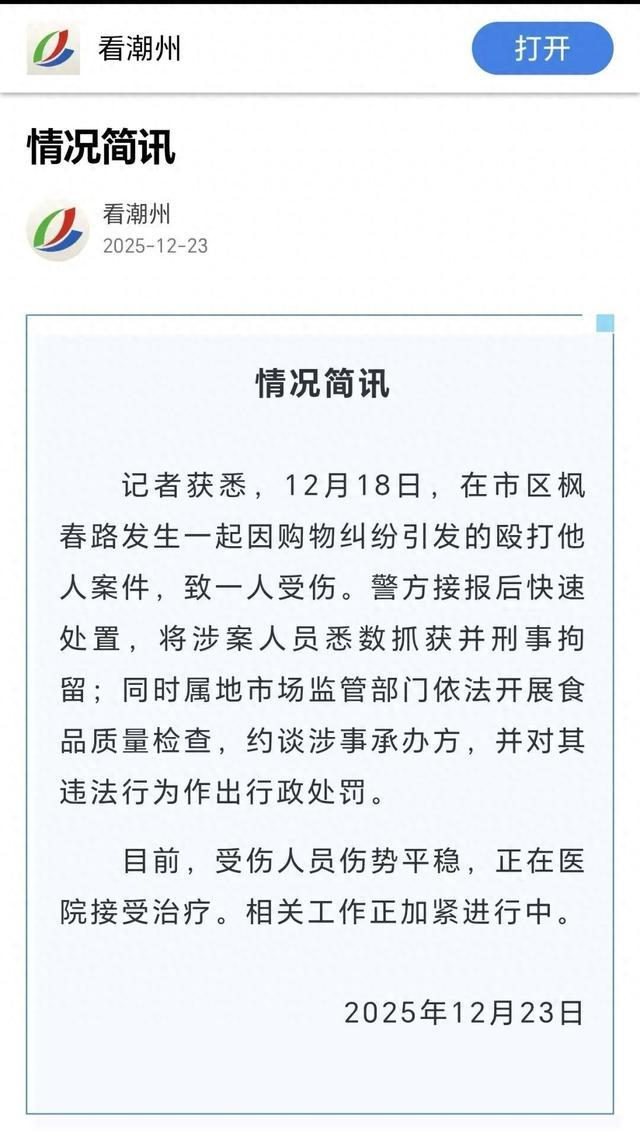 据潮州市相关通报,该起殴打他人案件发生于12月18日市区枫春路,因购物纠纷引发。警方接报后迅速开展处置工作,已将打人者全部抓获并依法刑事拘留。与此同时,属地市场监管部门同步启动行动,对涉事商家开展食品质量检查,约谈涉事承办方,并依据相关法律法规作出行政处罚。