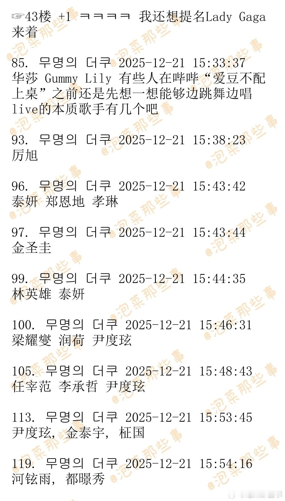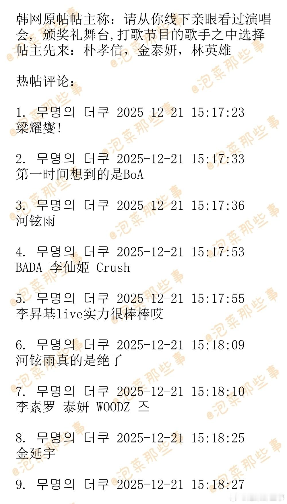 🔥🔥韩网900楼热帖评论翻译🔥🔥请说出live实力真的很能打的三位歌手韩网原帖帖主称:请从你线下亲眼看过演唱会, 颁奖礼舞台,打歌节目的歌手之中选择 帖主先来:朴孝信,金泰妍,林英雄cr.theqoo