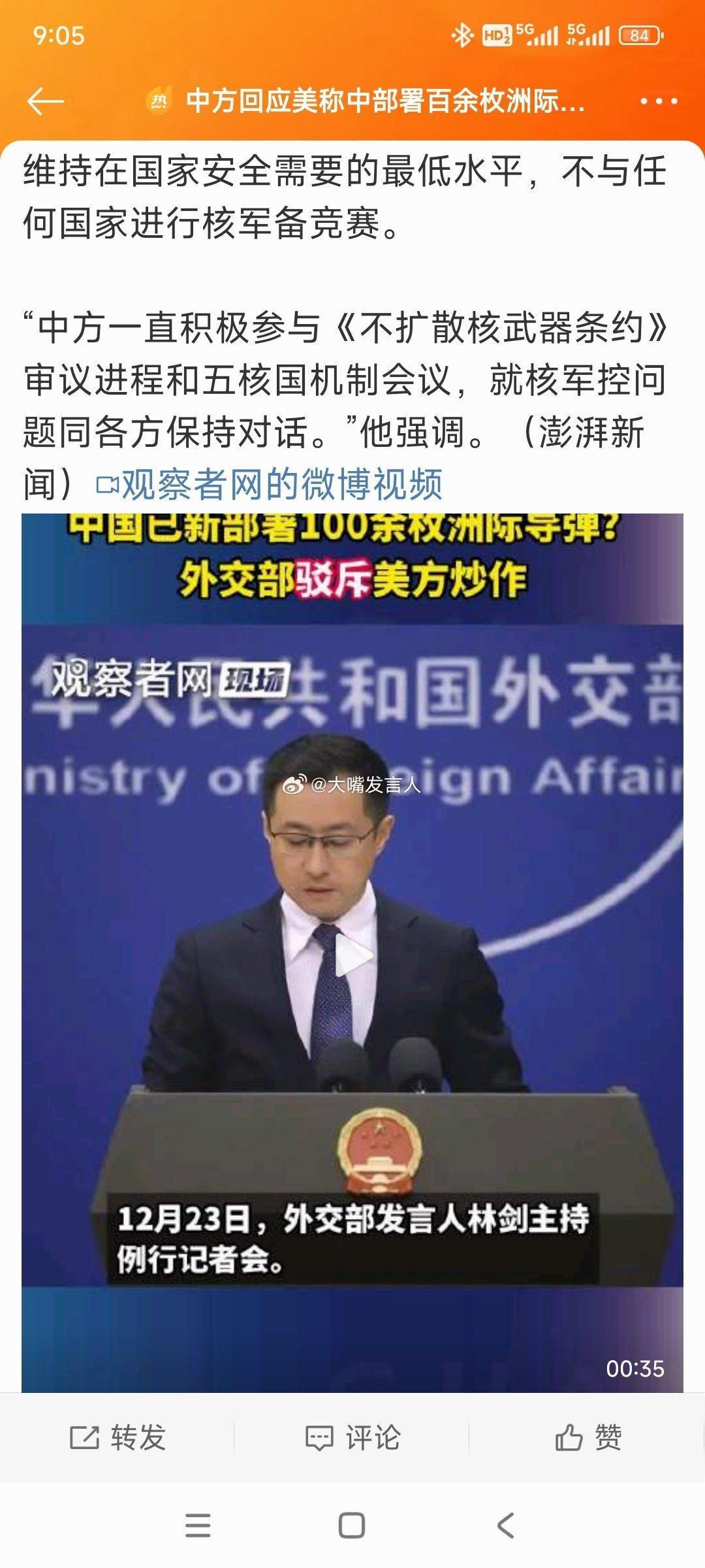 中方回应美称中部署百余枚洲际导弹 有句话叫,当美国说你有大杀器的时候,你最好