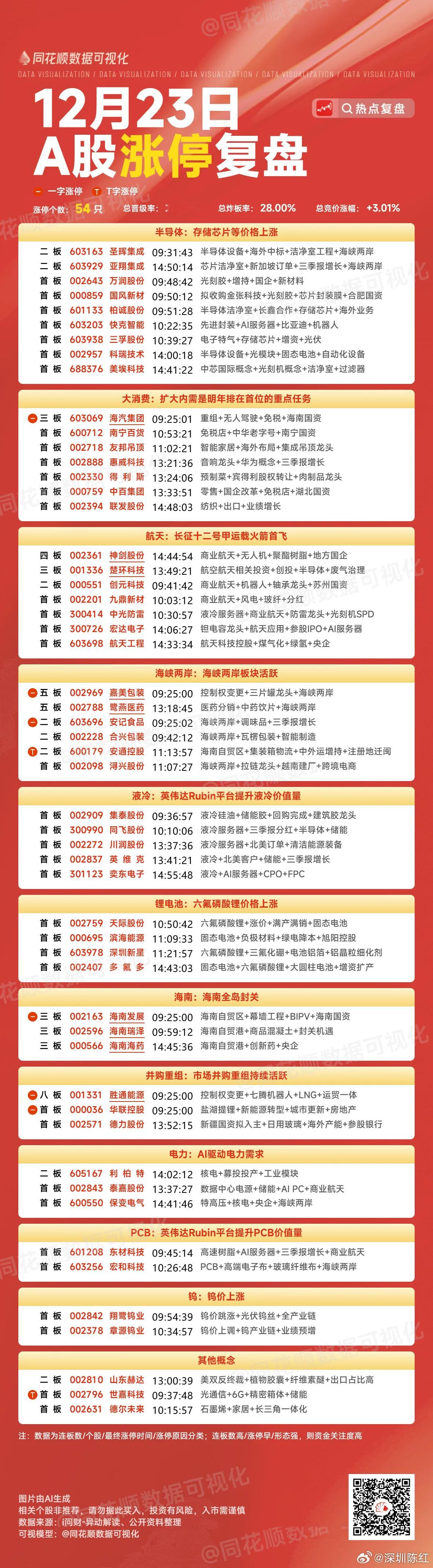 12月23日,今日涨停复盘(涨停54个),包括半导体等板块,市场情绪不佳。1、八连板:胜通能源2、五连板:嘉美包装、鹭燕医药3、四连板:神剑股份4、三连板:海南发展、海汽集团、海南瑞泽、海南海药、楚环科技5、二连板:安记食品、安通控股、合兴包装、亚翔集成、圣晖集成、创元科技等6、首板:国风新材、东材科技、华联控股、世嘉科技等
