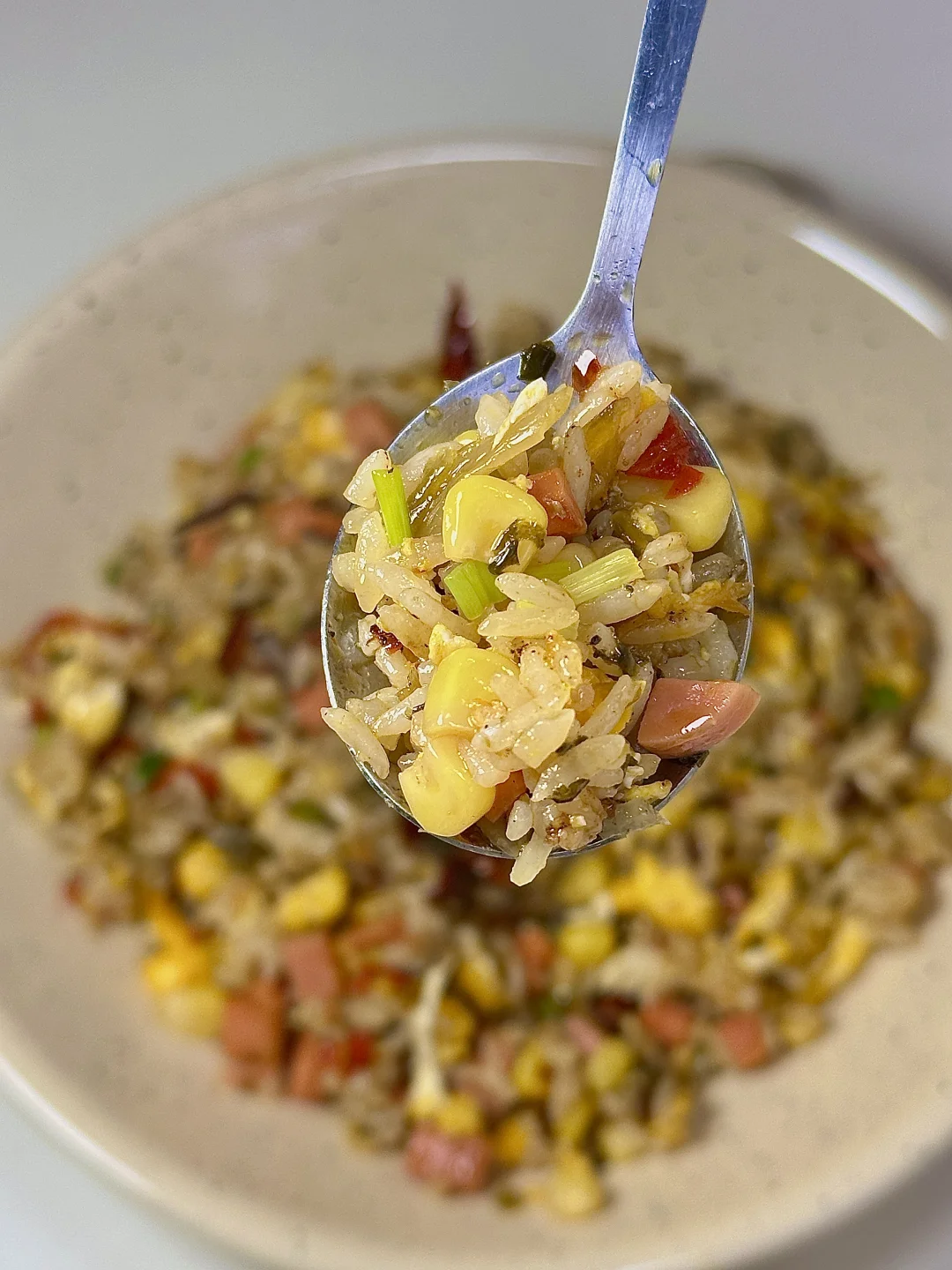 酸菜玉米火腿炒饭,巨开胃🤤一大碗吃完还不够,加了一小勺剁椒酱 很提味~