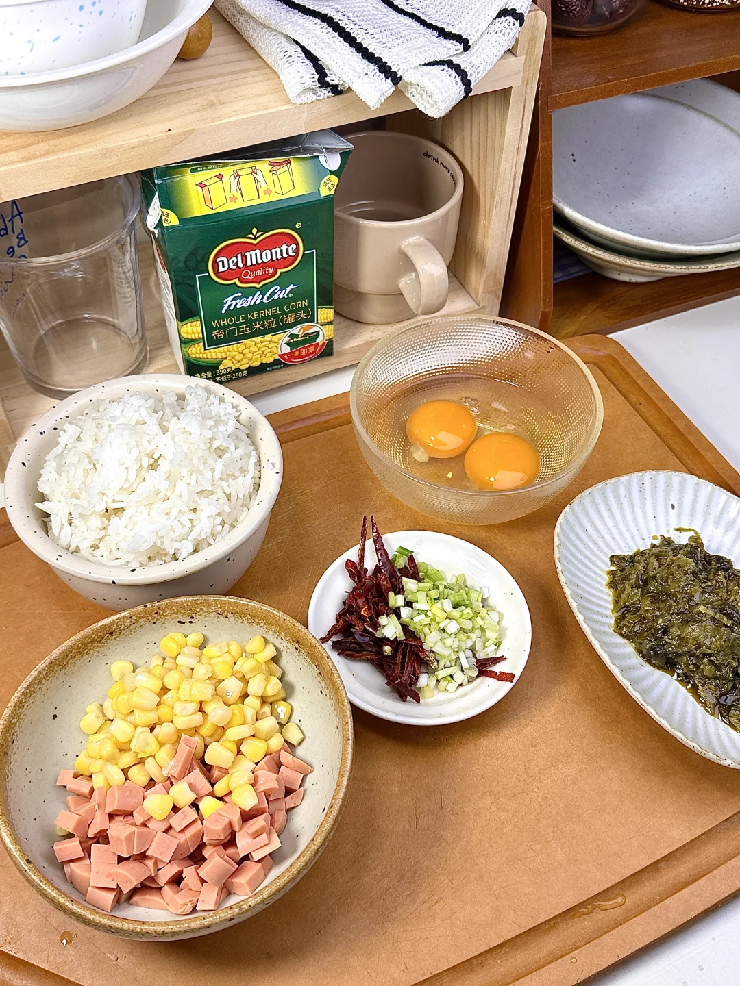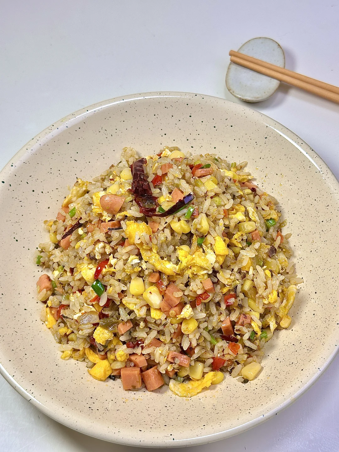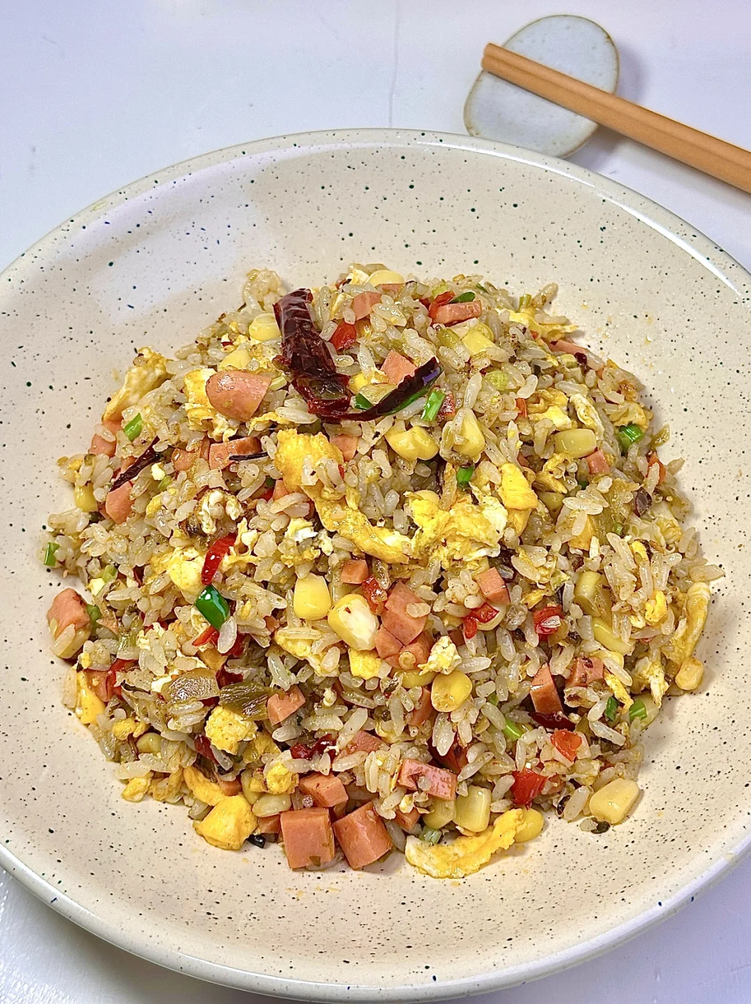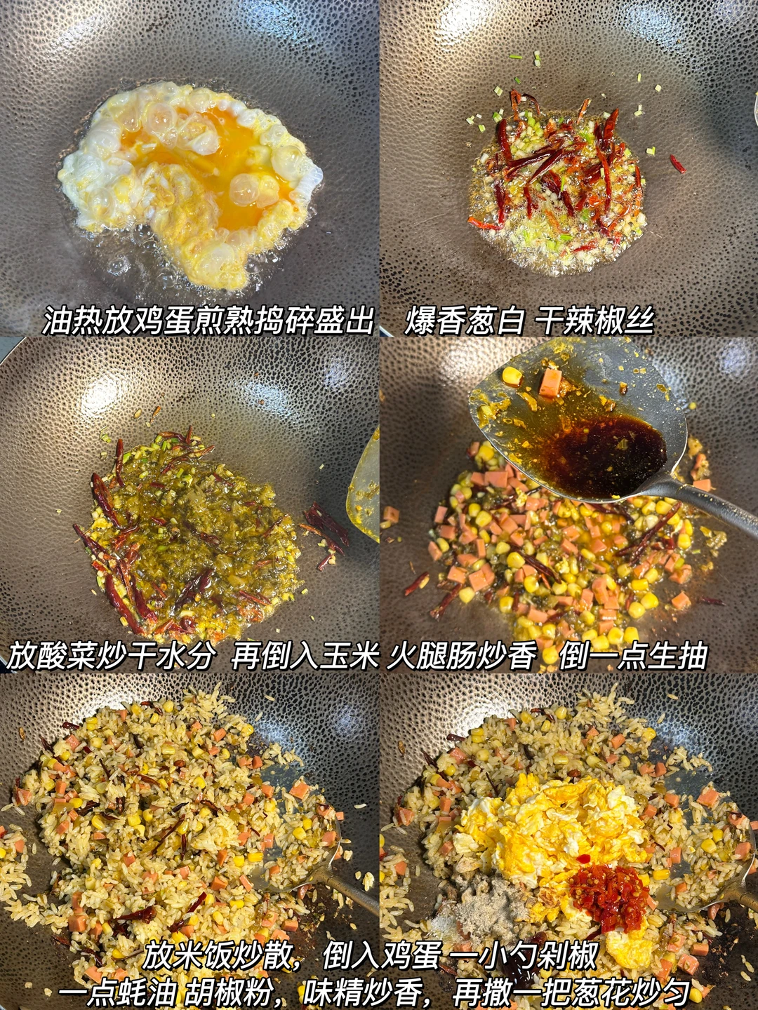 ✨食材:剩米饭 鸡蛋 酸菜 火腿肠 玉米粒 干辣椒丝 葱