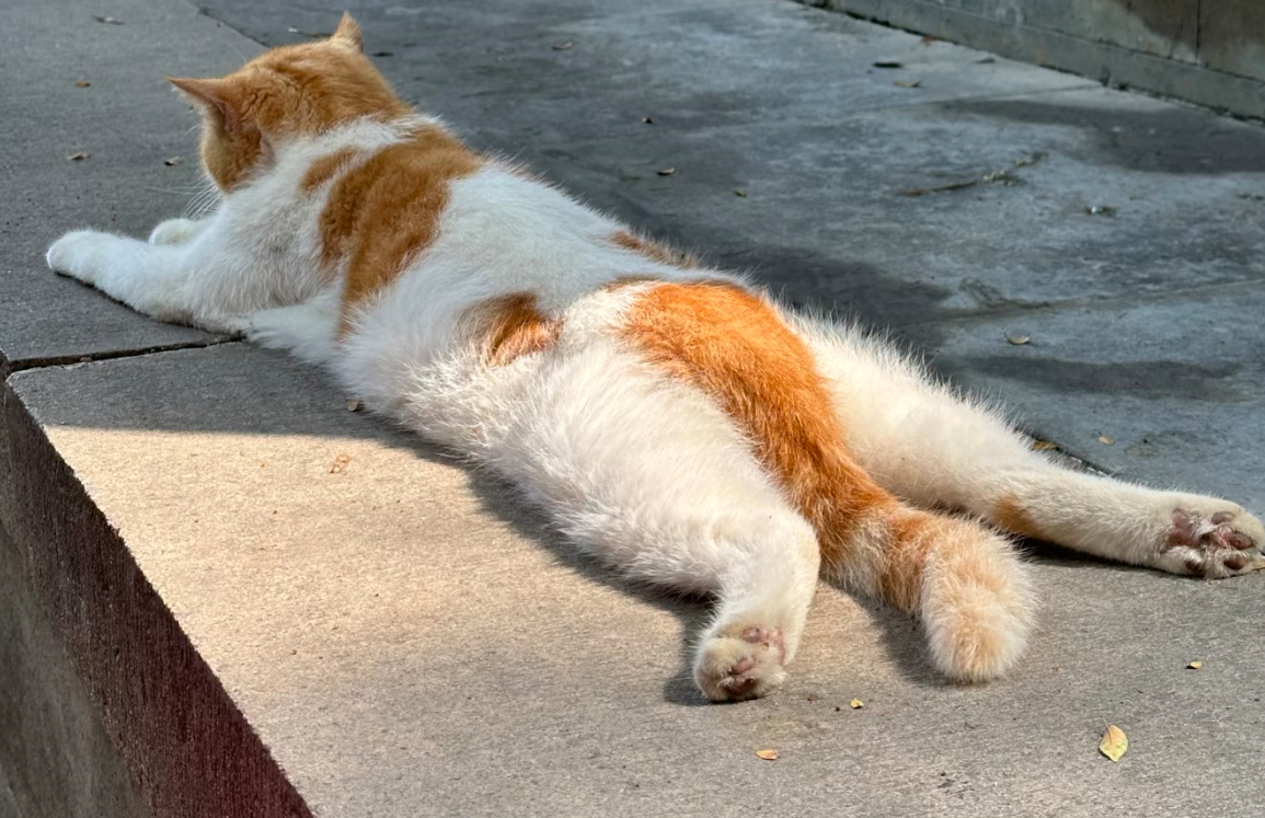 2025微博年度网红动物 去西园寺散心,刚踏上大殿的石阶,就撞见这只橘白猫正端坐在台阶上。它扁脸眯着眼,像尊小小的猫佛,任游客举着手机拍,连尾巴尖都懒得动一下,我忍不住蹲下来,从包里摸出寺里买的素猫条递过去。它慢悠悠凑过来,用鼻子嗅了嗅,叼起猫条就挪到一旁的石台上,蜷成个毛团子细嚼慢咽,那慢条斯理的样子,活像刚念完经的老僧在用斋。等吃完猫条,它索性舒展身子,把自己摊成一张长长的“猫饼”趴在石板上晒肚皮,白花花的肚子随着呼吸一起一伏,爪子还伸得老长,慵懒得不像话。我伸手轻轻摸它的头,它也不躲,只是甩了甩尾巴,继续闭眼打盹。更有趣的是,等我起身往庭院走,它居然慢悠悠跟了上来,一路跟到银杏树下,才蜷在树根旁重新睡下,仿佛是特意送我这一程,把西园寺的慵懒与平和,都蹭到了我的衣角上。
