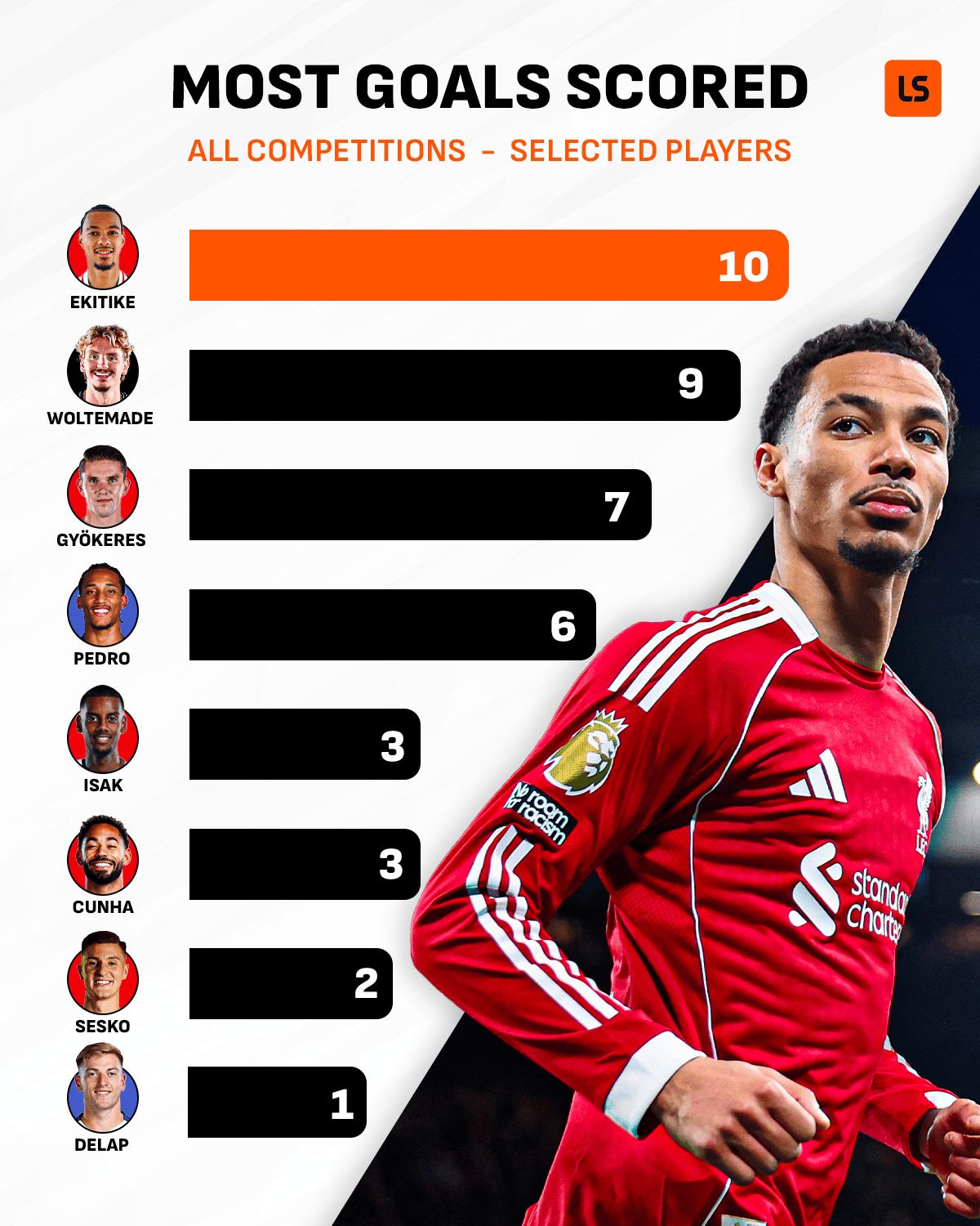 虎扑12月24日讯随着英超进入赛季中段、圣诞赛程密集开打之际,LiveScore发布一张“英超新援前锋(部分球员)各项赛事进球”对比图:利物浦前锋埃基蒂克以10球领跑。