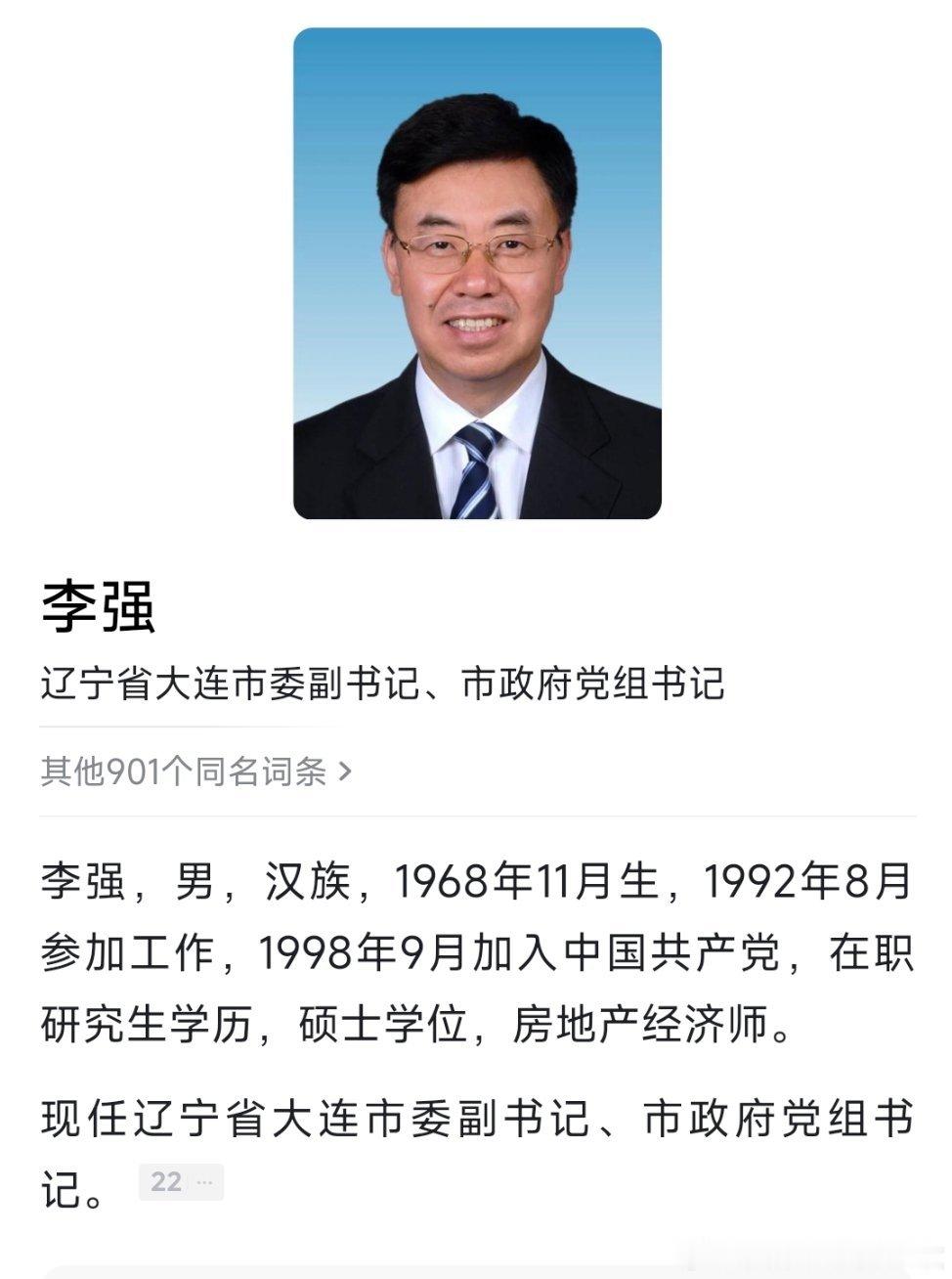 此前担任辽宁省副省长、省政府党组成员的李强,已任大连市委副书记、市政府党组书记。