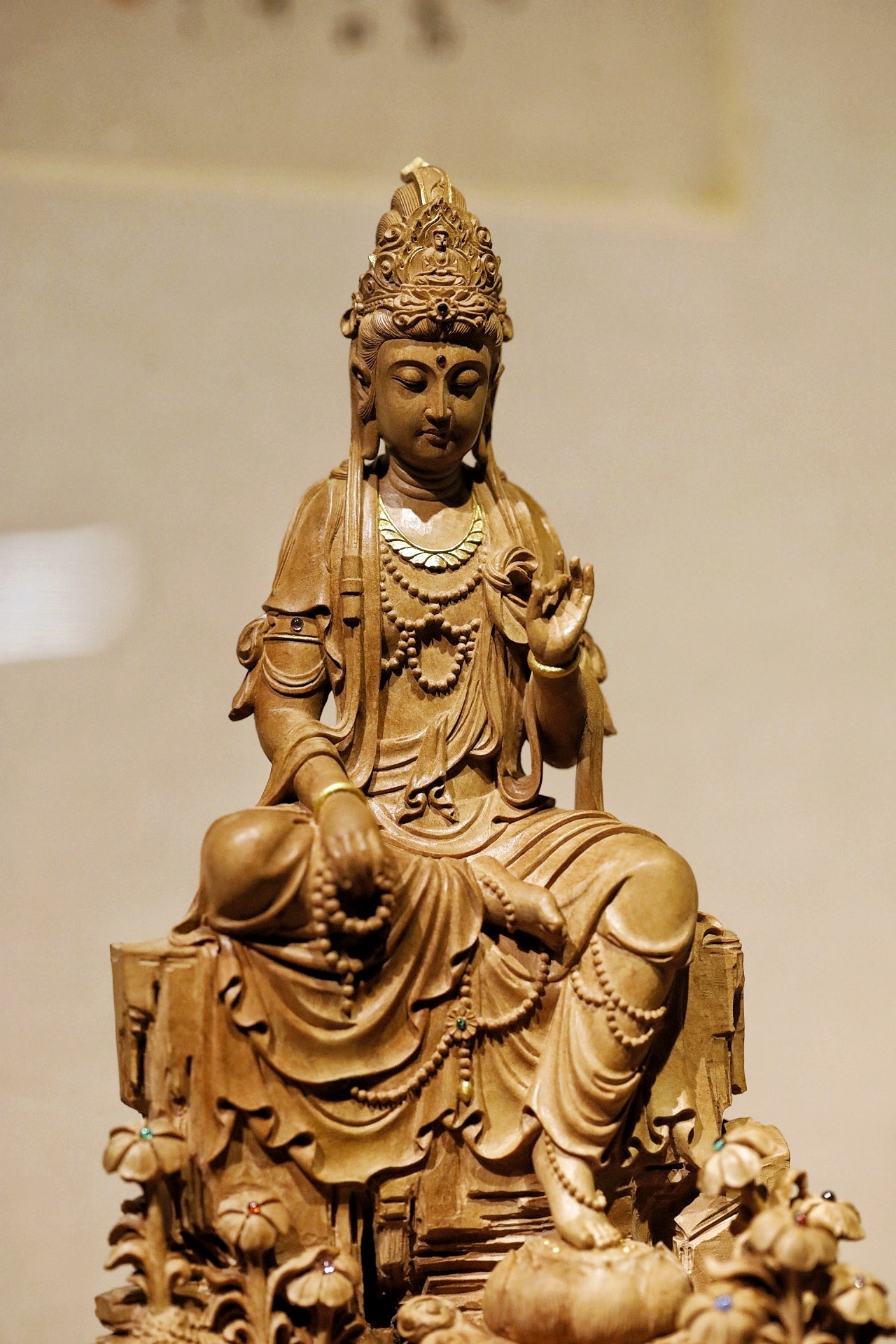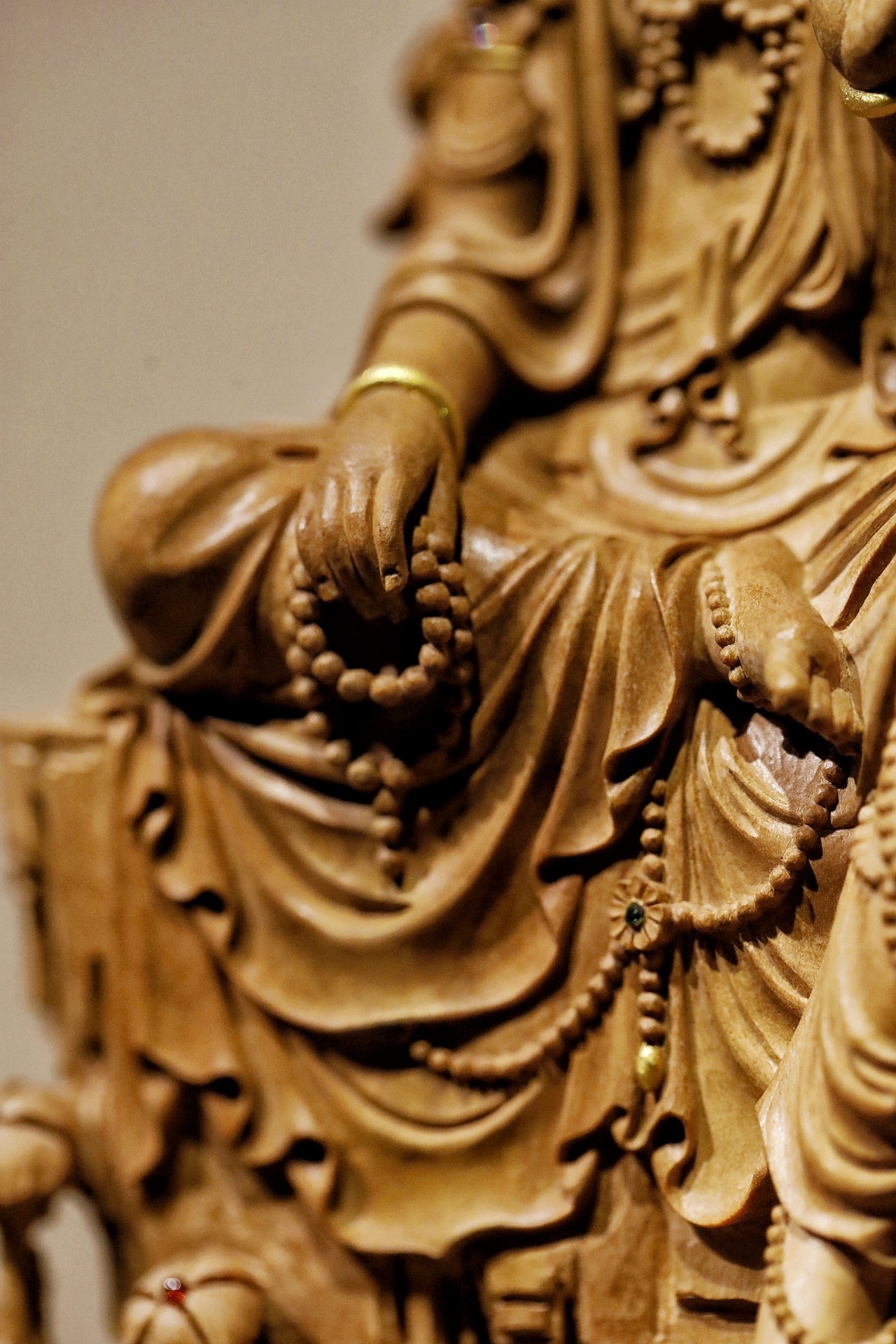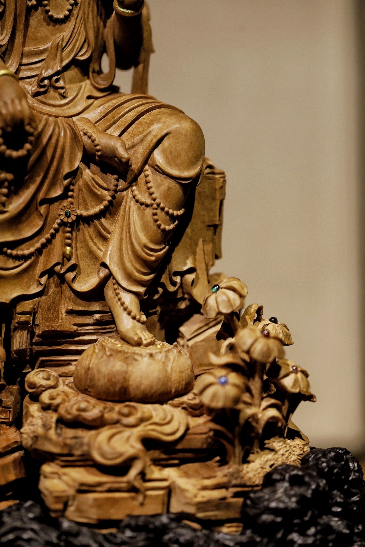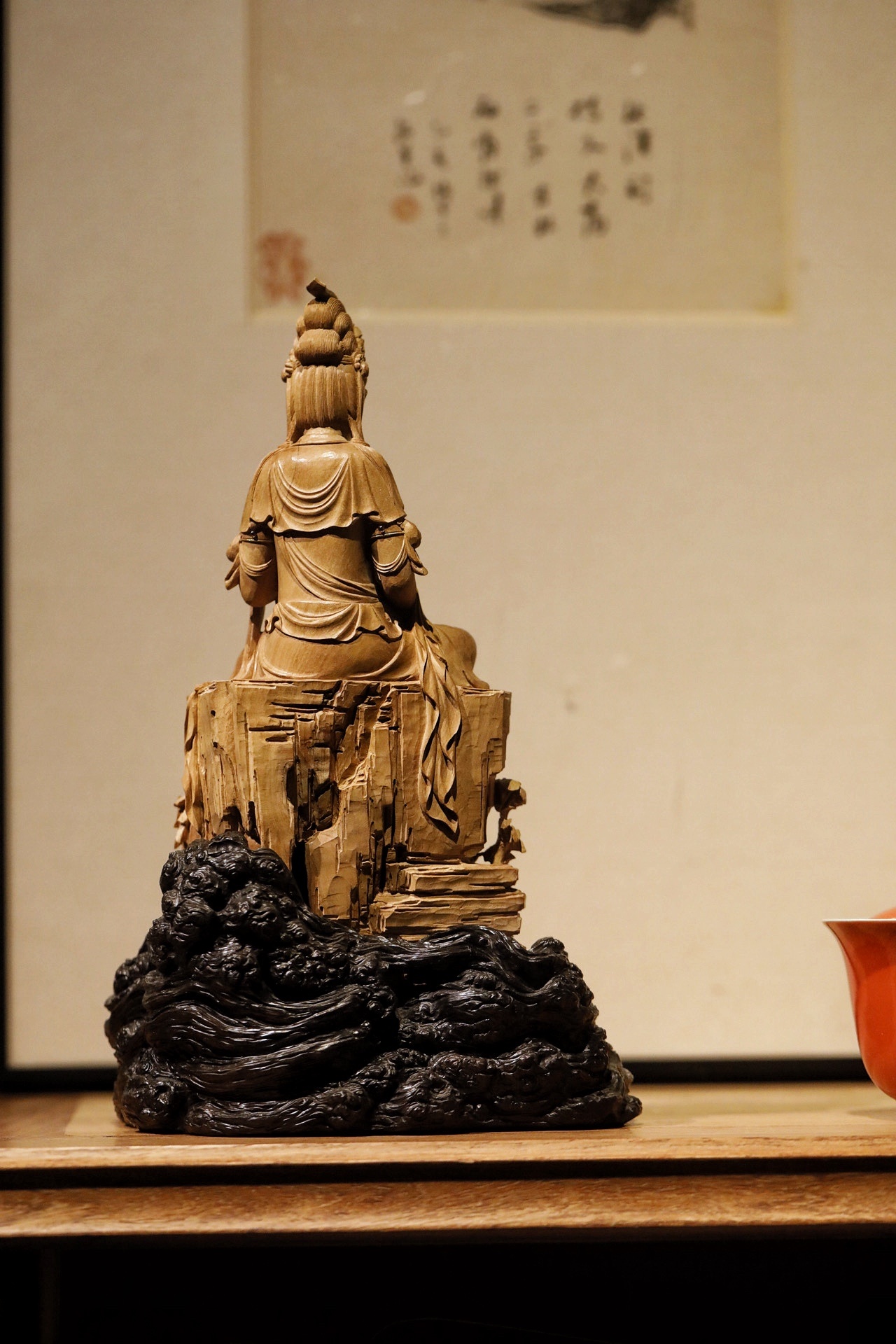 老山檀香|持珠观音·清刀制像取整料成器,雕观音自在趺坐,手持念珠、颔首垂目,面容温婉慈悲,衣袂层叠如流云。木雕细节毕现,璎珞、莲台雕琢精巧,檀香醇厚沁脾,兼具观瞻之美与禅修之韵,为收藏重器。规格:13×10×23cm重量490g底座:19×12×10cm整体高度27cm