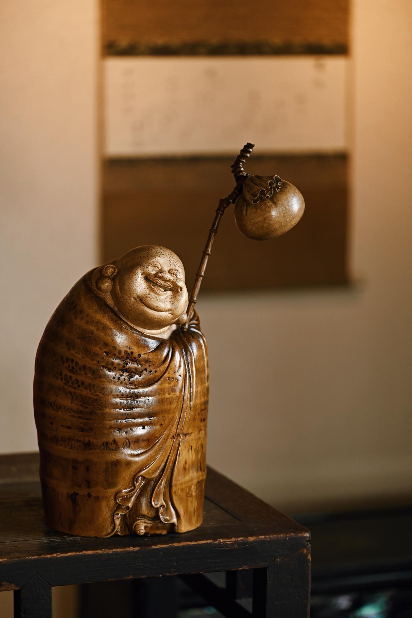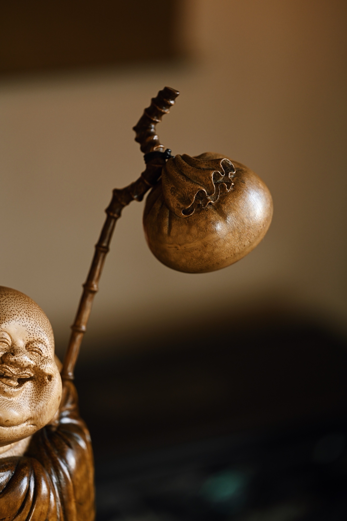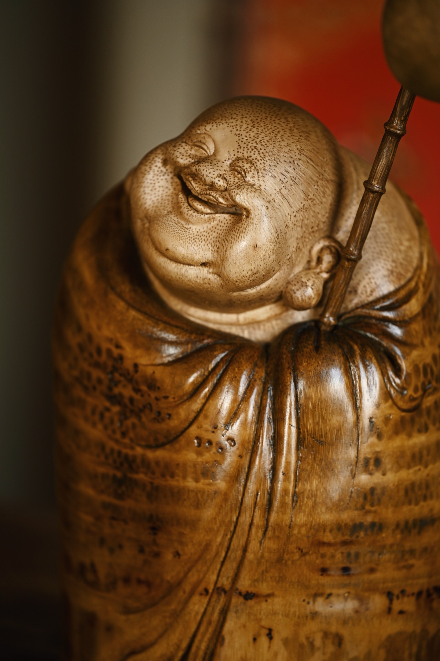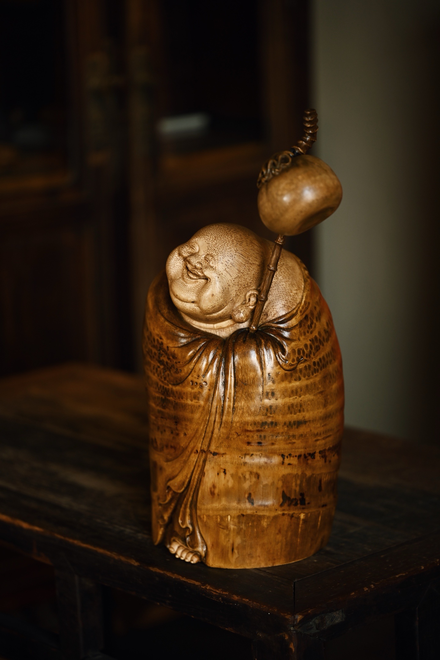 竹雕仿古 | 布袋弥勒佛弥勒形神相融,笑意欢喜豁达,大肚能容天下事,左手持杖,杖首挂布袋,既添俏皮灵动,又衬弥勒慈悲随和。整体20*19*44cm 2496g 人物高32cm