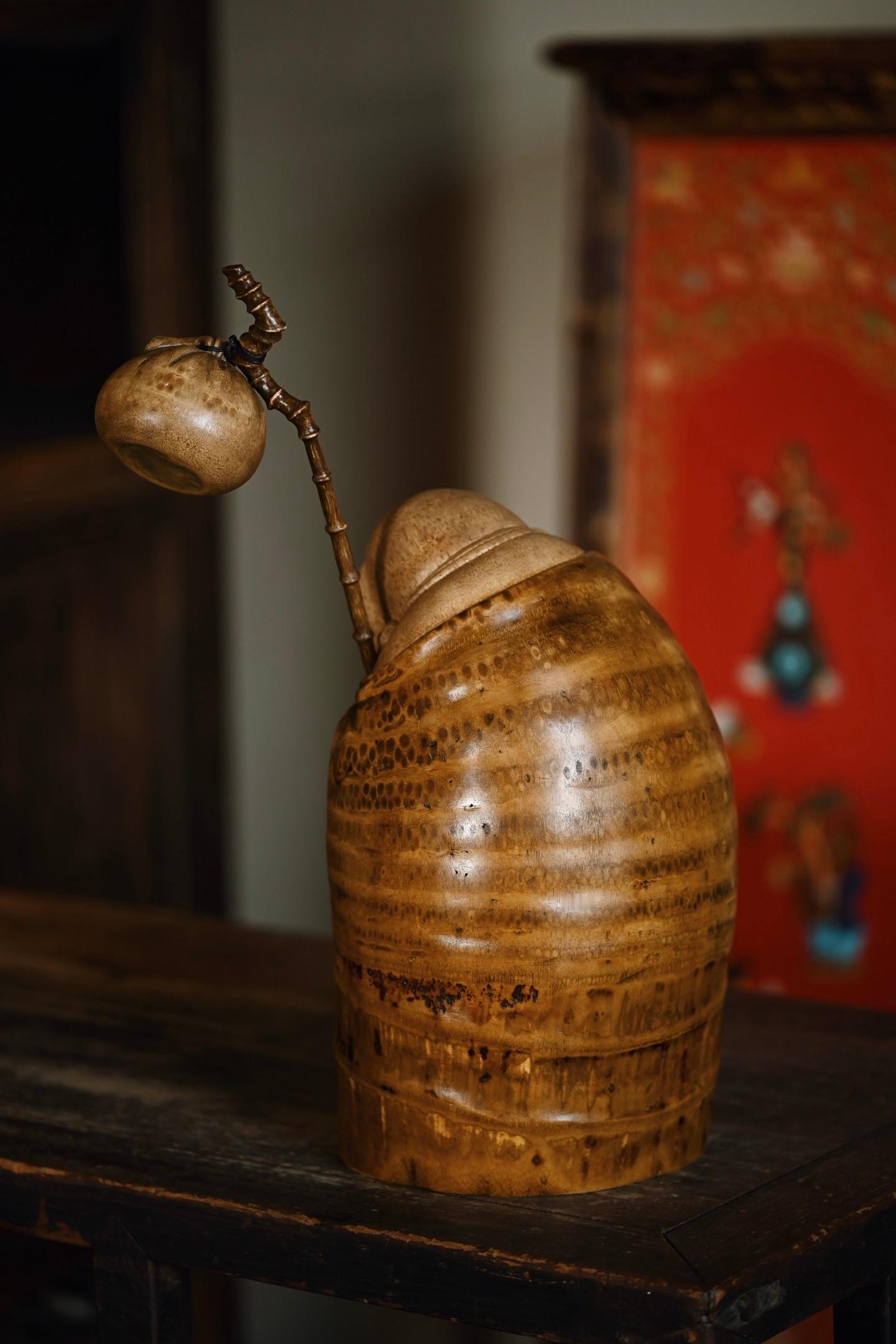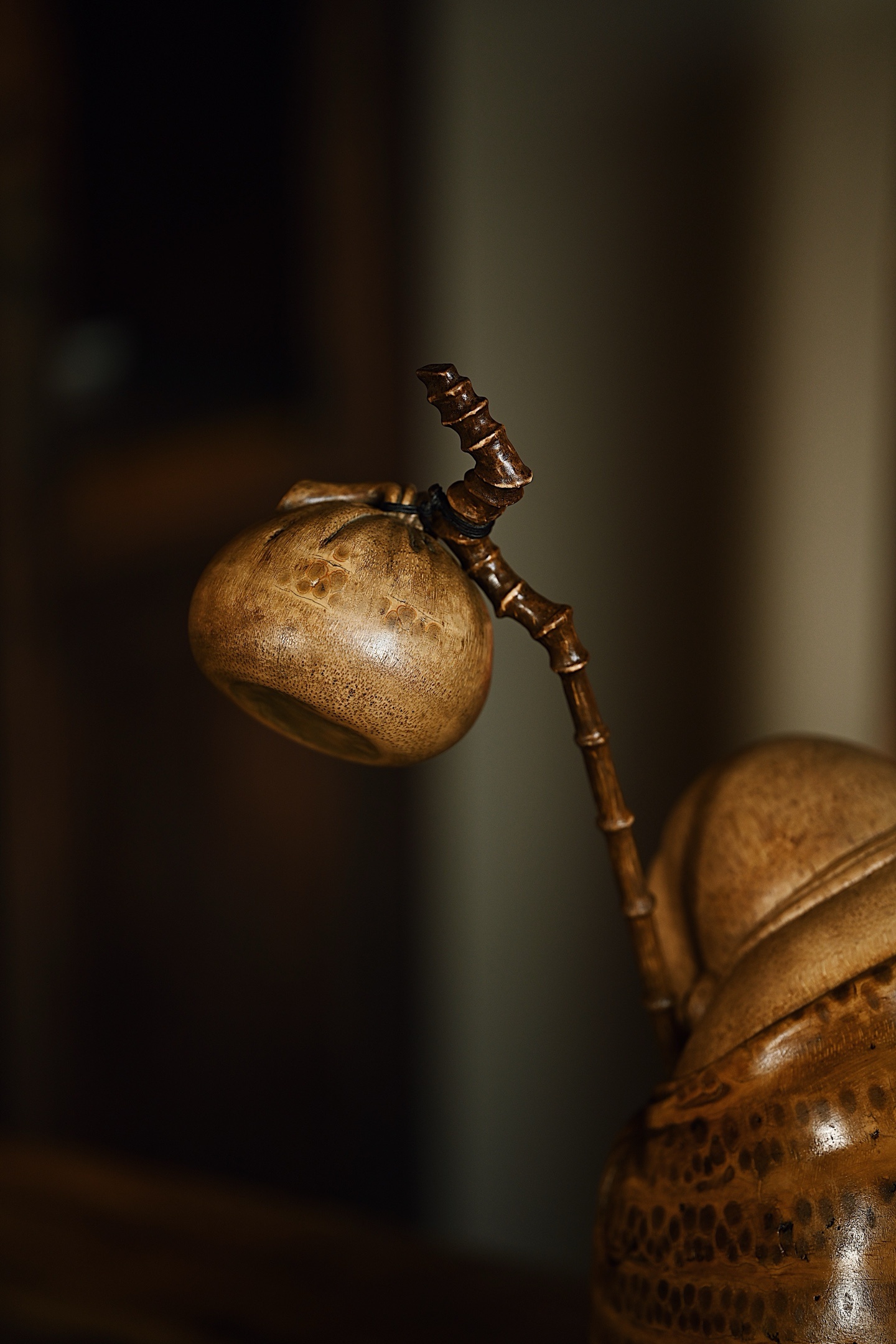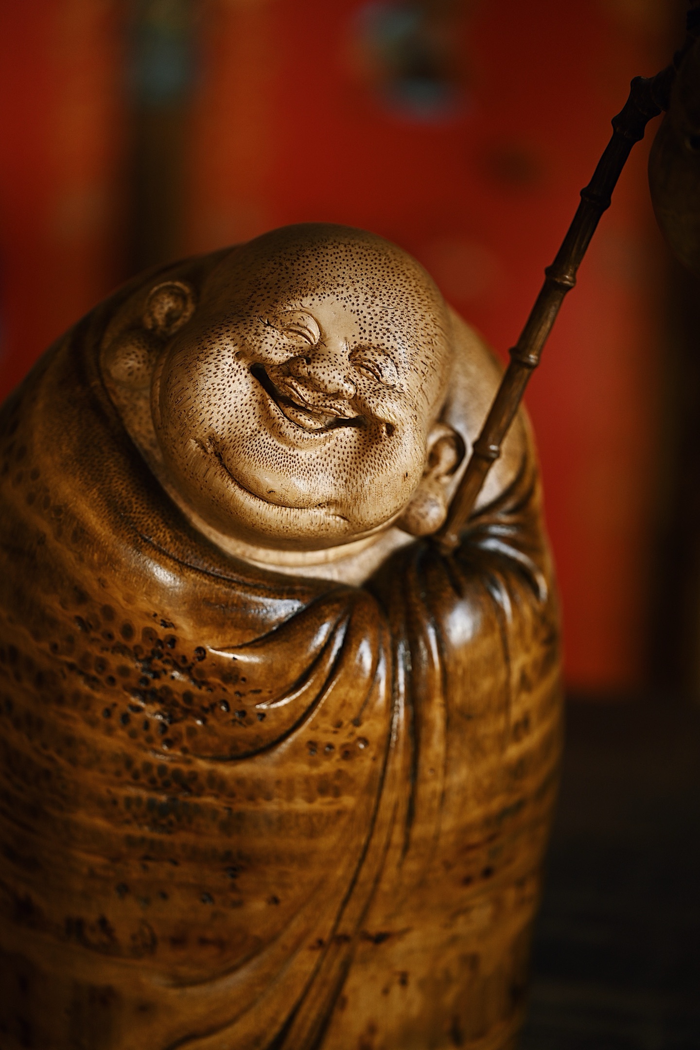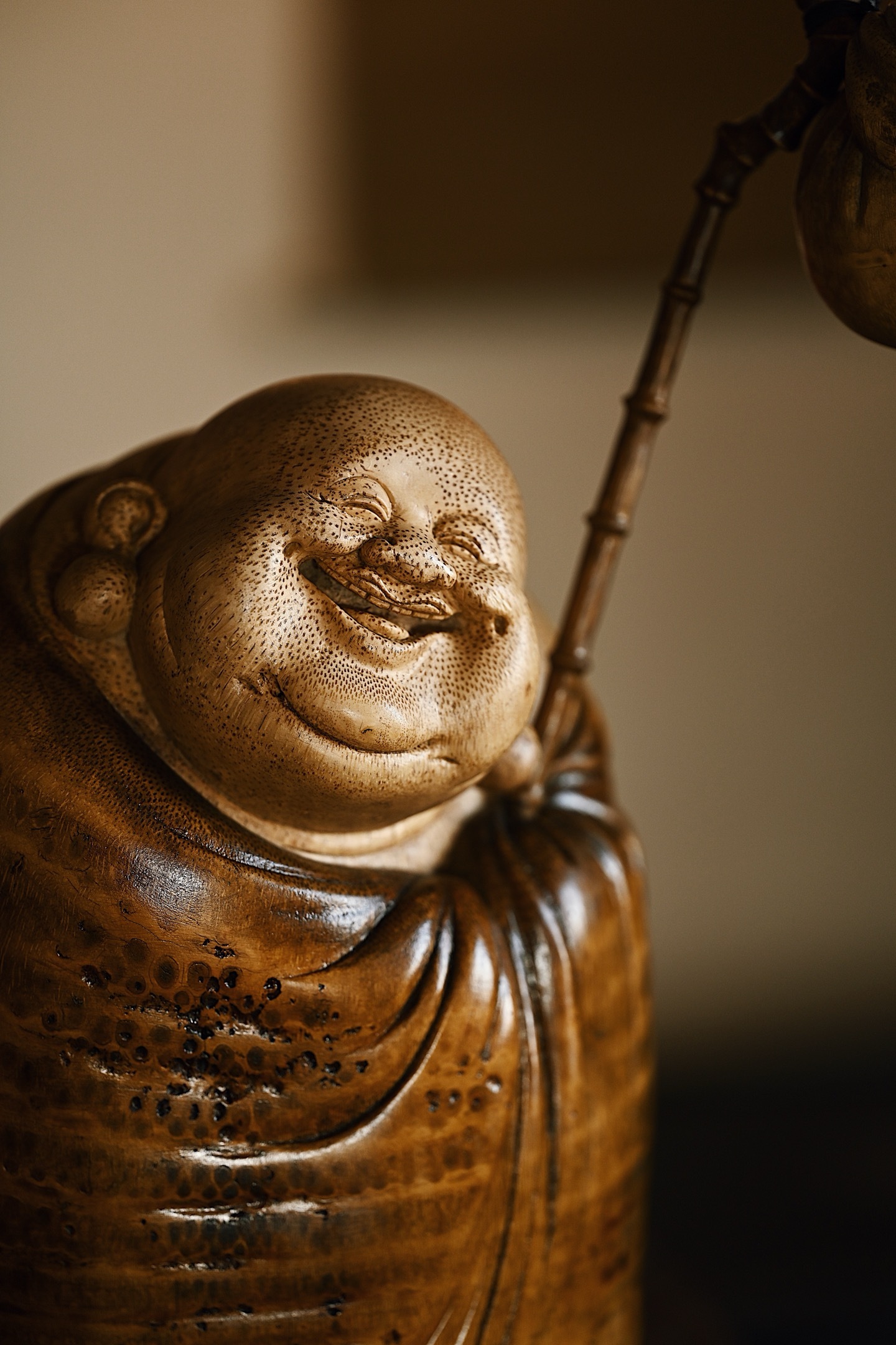 竹雕仿古 | 布袋弥勒佛弥勒形神相融,笑意欢喜豁达,大肚能容天下事,左手持杖,杖首挂布袋,既添俏皮灵动,又衬弥勒慈悲随和。整体20*19*44cm 2496g 人物高32cm