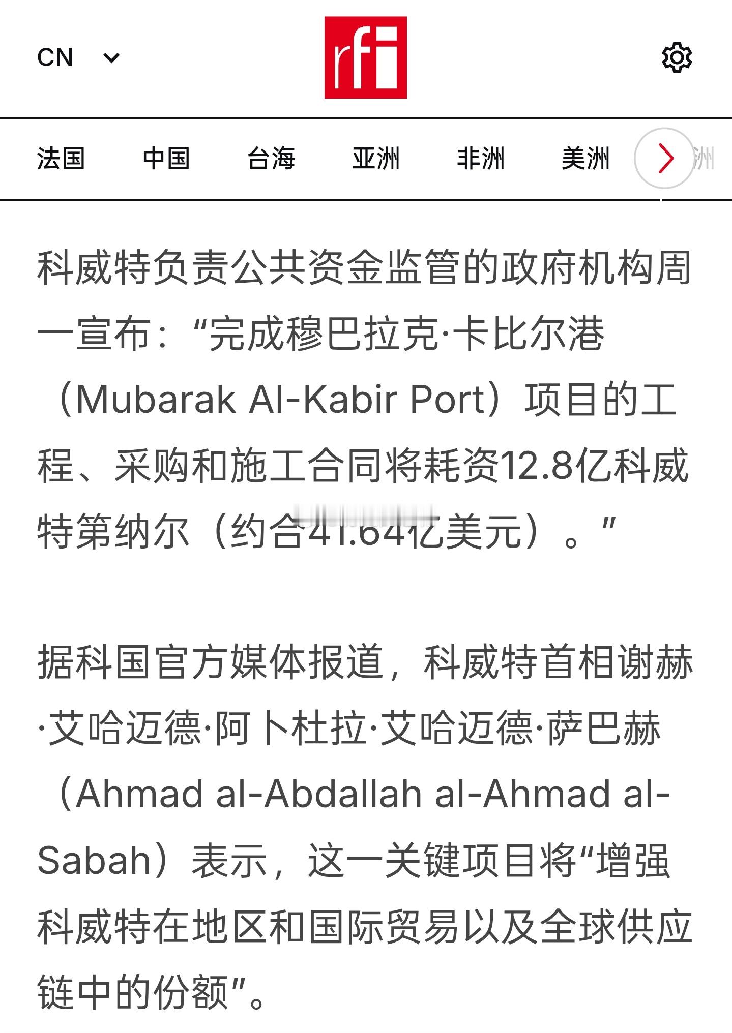 据法新社报道,科威特与中国签署了一项价值41亿美元的协议,旨在完成一座大型港口的建设。目前,这个石油资源丰富的中东国家正寻求实现经济多元化。据科国官方媒体报道,科威特首相萨巴赫表示,这一关键项目将“增强科威特在地区和国际贸易以及全球供应链中的份额”。