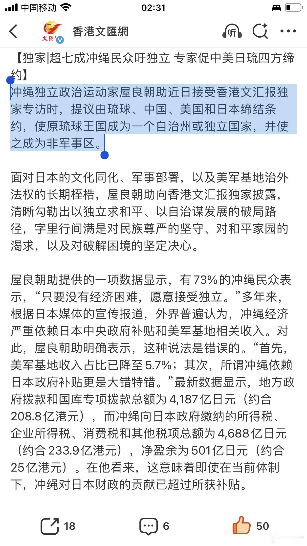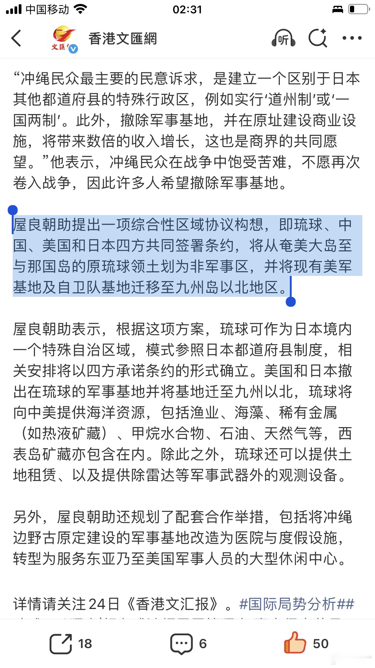 【文汇报独家专访│超七成冲绳民众吁独立 专家促中美日琉四方缔约】冲绳独立政治运动家屋良朝助近日接受香港文汇报独家专访时,提议由琉球、中国、美国和日本缔结条约,使原琉球王国成为一个自治州或独立国家,并使之成为非军事区。面对日本的文化同化、军事部署,以及美军基地治外法权的长期桎梏,屋良朝助向香港文汇报独家披露,清晰勾勒出以独立求和平、以自治谋发展的破局路径,字里行间满是对民族尊严的坚守、对和平家园的渴求,以及对破解困境的坚定决心。屋良朝助提供的一项数据显示,有73%的冲绳民众表示,“只要没有经济困难,愿意接受独立。”多年来,根据日本媒体的宣传报道,外界普遍认为,冲绳经济严重依赖日本中央政府补贴和美军基地相关收入。对此,屋良朝助明确表示,这种说法是错误的。“首先,美军基地收入占比已降至5.7%;其次,所谓冲绳依赖日本政府补贴更是大错特错。”最新数据显示,地方政府拨款和国库专项拨款总额为4,187亿日元(约合208.8亿港元),而冲绳向日本政府缴纳的所得税、企业所得税、消费税和其他税项总额为4,688亿日元(约合233.9亿港元),净盈余为501亿日元(约合25亿港元)。在他看来,这意味着即使在当前体制下,冲绳对日本财政的贡献已超过所获补贴。“冲绳民众最主要的民意诉求,是建立一个区别于日本其他都道府县的特殊行政区,例如实行‘道州制’或‘一国两制’。此外,撤除军事基地,并在原址建设商业设施,将带来数倍的收入增长,这也是商界的共同愿望。”他表示,冲绳民众在战争中饱受苦难,不愿再次卷入战争,因此许多人希望撤除军事基地。屋良朝助提出一项综合性区域协议构想,即琉球、中国、美国和日本四方共同签署条约,将从奄美大岛至与那国岛的原琉球领土划为非军事区,并将现有美军基地及自卫队基地迁移至九州岛以北地区。屋良朝助表示,根据这项方案,琉球可作为日本境内一个特殊自治区域,模式参照日本都道府县制度,相关安排将以四方承诺条约的形式确立。美国和日本撤出在琉球的军事基地并将基地迁至九州以北,琉球将向中美提供海洋资源,包括渔业、海藻、稀有金属(如热液矿藏)、甲烷水合物、石油、天然气等,西表岛矿藏亦包含在内。除此之外,琉球还可以提供土地租赁、以及提供除雷达等军事武器外的观测设备。另外,屋良朝助还规划了配套合作举措,包括将冲绳边野古原定建设的军事基地改造为医院与度假设施,转型为服务东亚乃至美国军事人员的大型休闲中心。详情请关注24日《香港文汇报》。国际局势分析琉球 獨家│超七成沖繩民眾籲獨立 專家促中美日琉四方締約