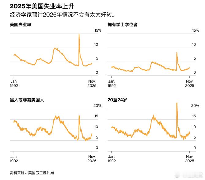 2025年对美国求职者来说已经很艰难,而2026年看起来也不会明显好转。彭博对经济学家的调查显示,尽管美国经济仍在增长,但失业率将在2026年大部分时间里维持在较高水平。这种“经济不差、工作却难找”的反常组合,部分原因在于AI投资正在推动增长,却并没有带来相应的就业岗位。劳动力市场的停滞意味着,未来一年职位空缺仍然有限,工资涨幅持续放缓,美国家庭的负担压力不会明显减轻。2025年新增就业几乎全部来自医疗和护理行业,除去该行业,前11个月美国整体非农就业实际上是减少的。从2025年6月到11月,失业率上升了0.5个百分点,达到4.6%,这种走势通常只在经济下行周期中出现。虽然美国并未陷入衰退,但许多求职者在2025年下半年已经“体感衰退”。白领岗位冻结尤为明显,大学学历人群受到的冲击反而更大,年轻大学毕业生过去在就业市场上的优势今年几乎消失。招聘率处于历史低位,而裁员公告在近期有所增加,加剧了就业焦虑。工资增长也明显降温,与2022–2023年“劳动力强势、企业抢人”的环境形成鲜明反转,如今议价权重新回到雇主手中。尤其值得注意的是,低收入群体的工资涨幅已明显落后于高收入群体,加剧了“K型分化”。从结构上看,黑人失业率在2025年下半年快速上升,达到8.3%,接近近年来高点。在劳动力市场降温时,黑人群体往往受到更大冲击,而本届政府压缩联邦雇员规模,也对这一群体形成额外压力。多位经济学家警告,2026年这种不均衡可能进一步加剧。展望2026年,经济学家预计美国GDP仍将增长约 2%,由消费和企业投资支撑,美联储也可能继续降息,税收政策和贸易不确定性略有缓和。但即便如此,就业改善仍需时间,失业率在2026年平均水平可能高于2025年,且风险偏向“更糟而非更好”。